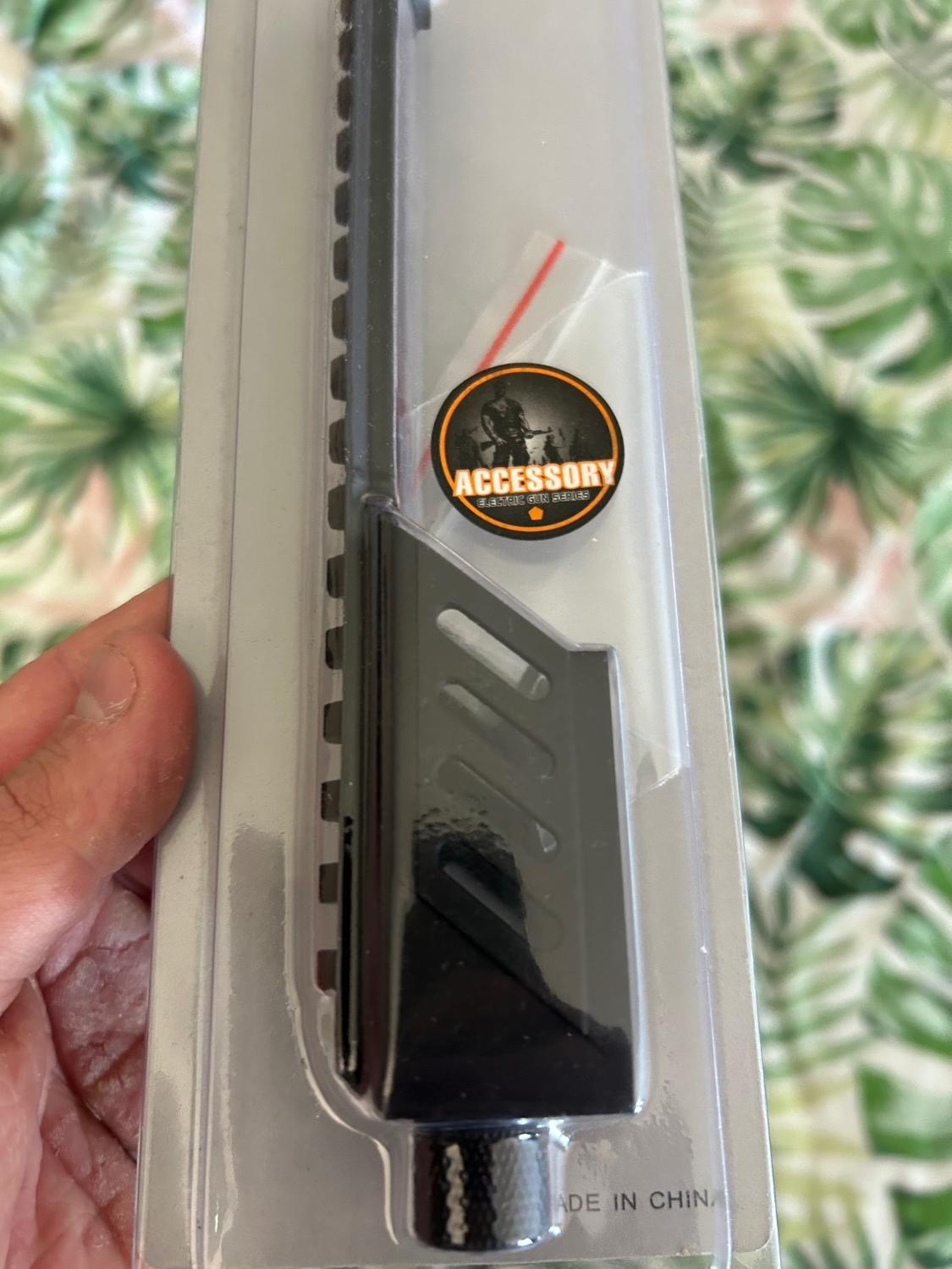 comes with a Tokyo marui flashlight, lipo battery, stretch band that attaches to the gun and yourself and a brand new unfitted top rail so that you add a silencer and scope to the gun