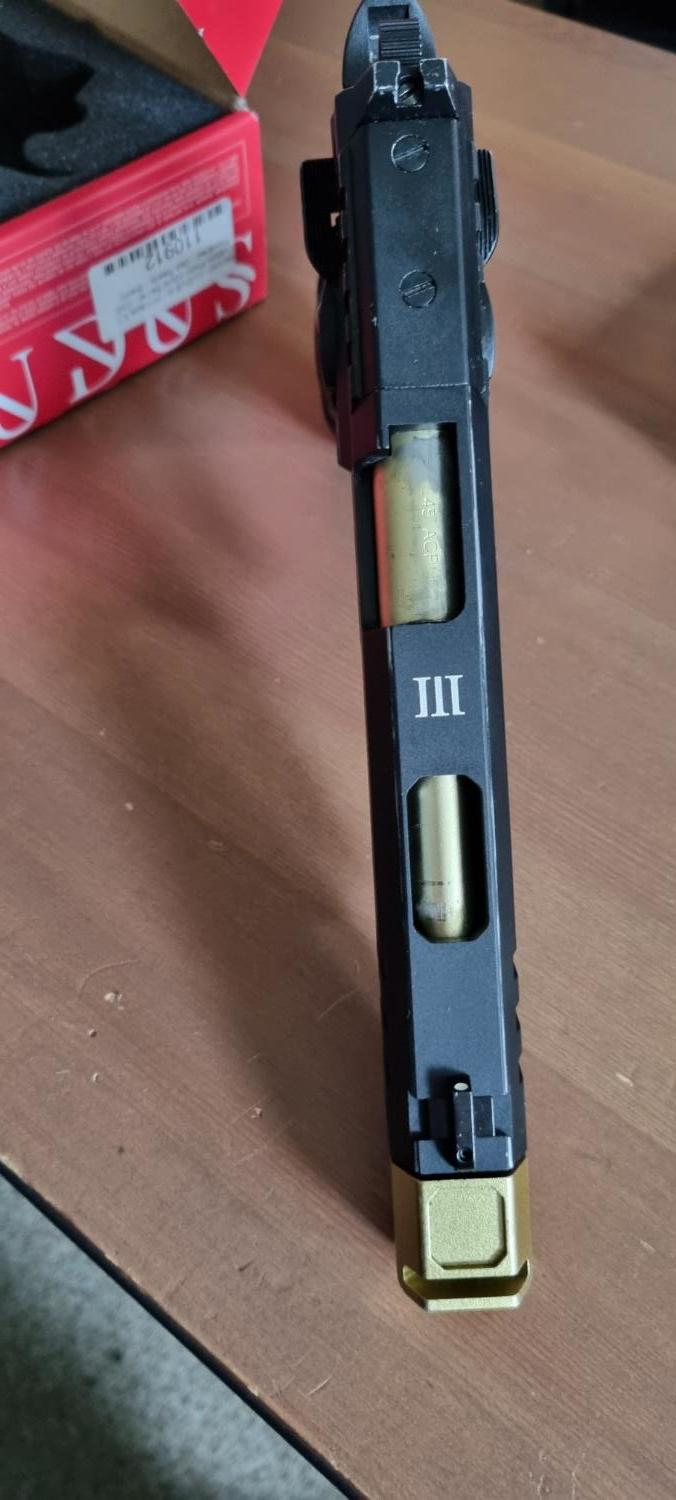 Priced low to sell. Solid, hard-kicking and loud sidearm. No upgrades. Paint worn off a bit on the slide and barrel from use.
