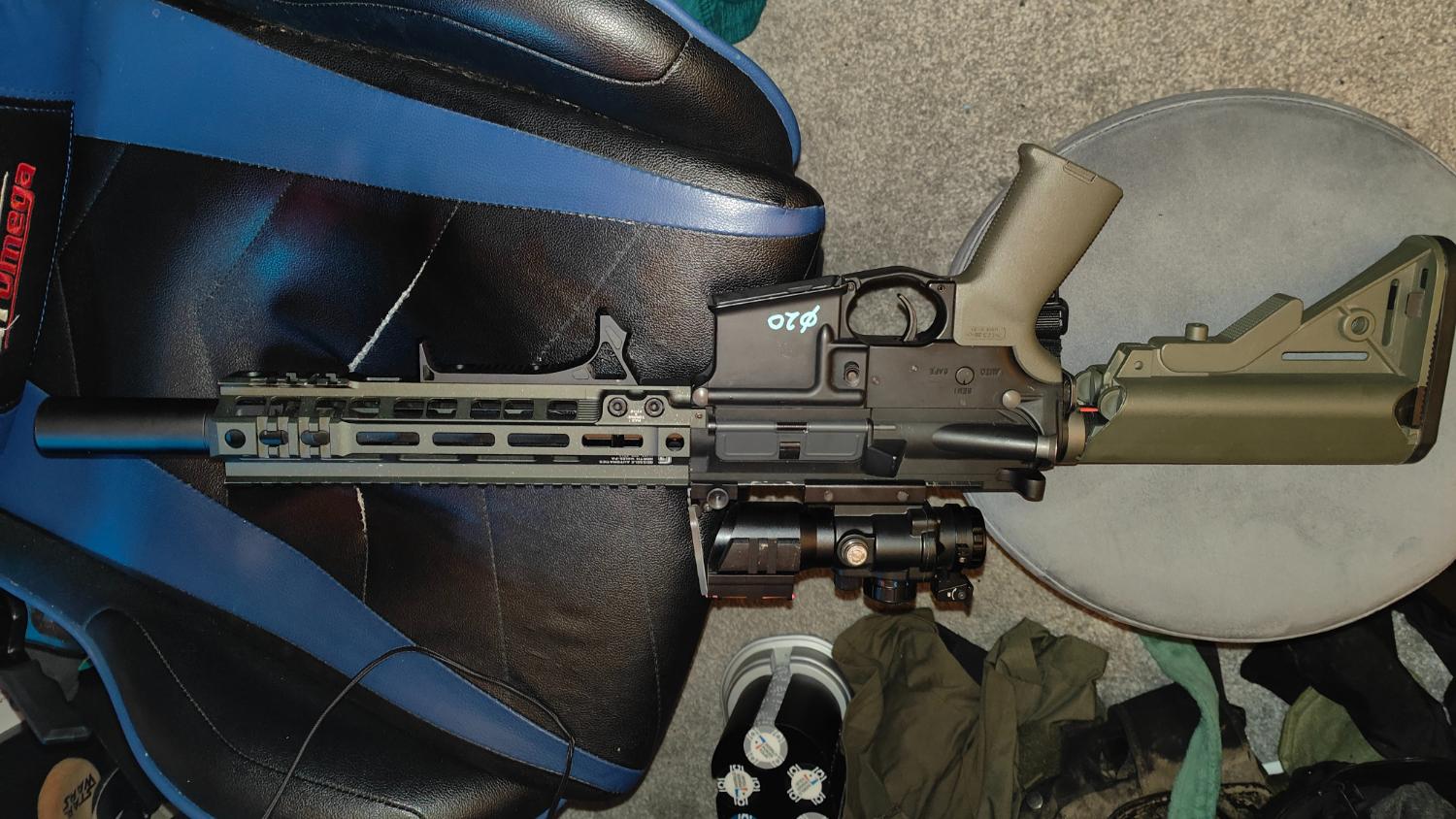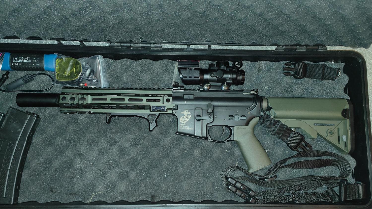 Built using the excellent KWA RM4 platform, by adding this Beautiful dark green 9.5" Gisele rail, green Magpul MOE pistol grip and green stock.