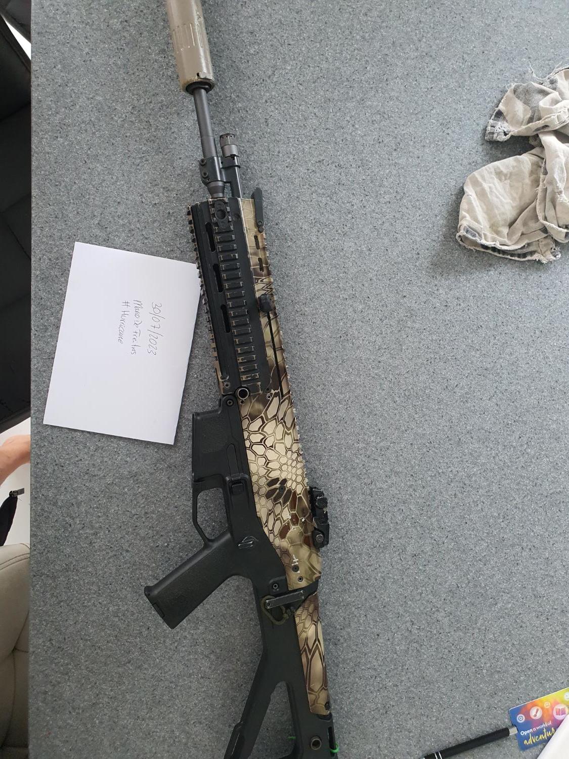 The upper receiver is hydro dipped and all is missing is the gearbox, the gearbox box is broken but will include gearbox parts in the sale, like motor and gears