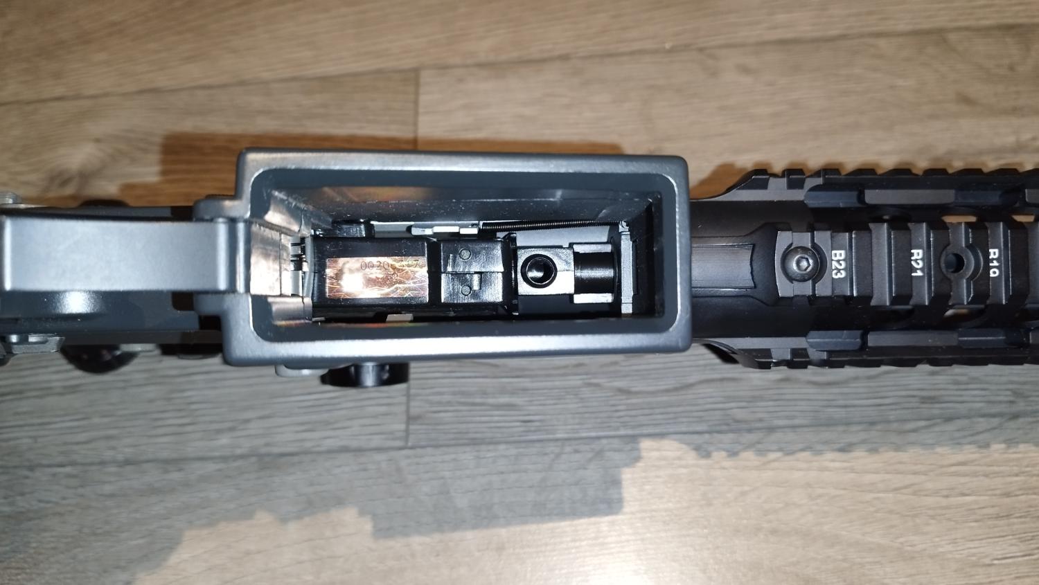 Is locked to semi by the fire selector, gearbox never opened, has quick spring change so u can install stronger springs easily.