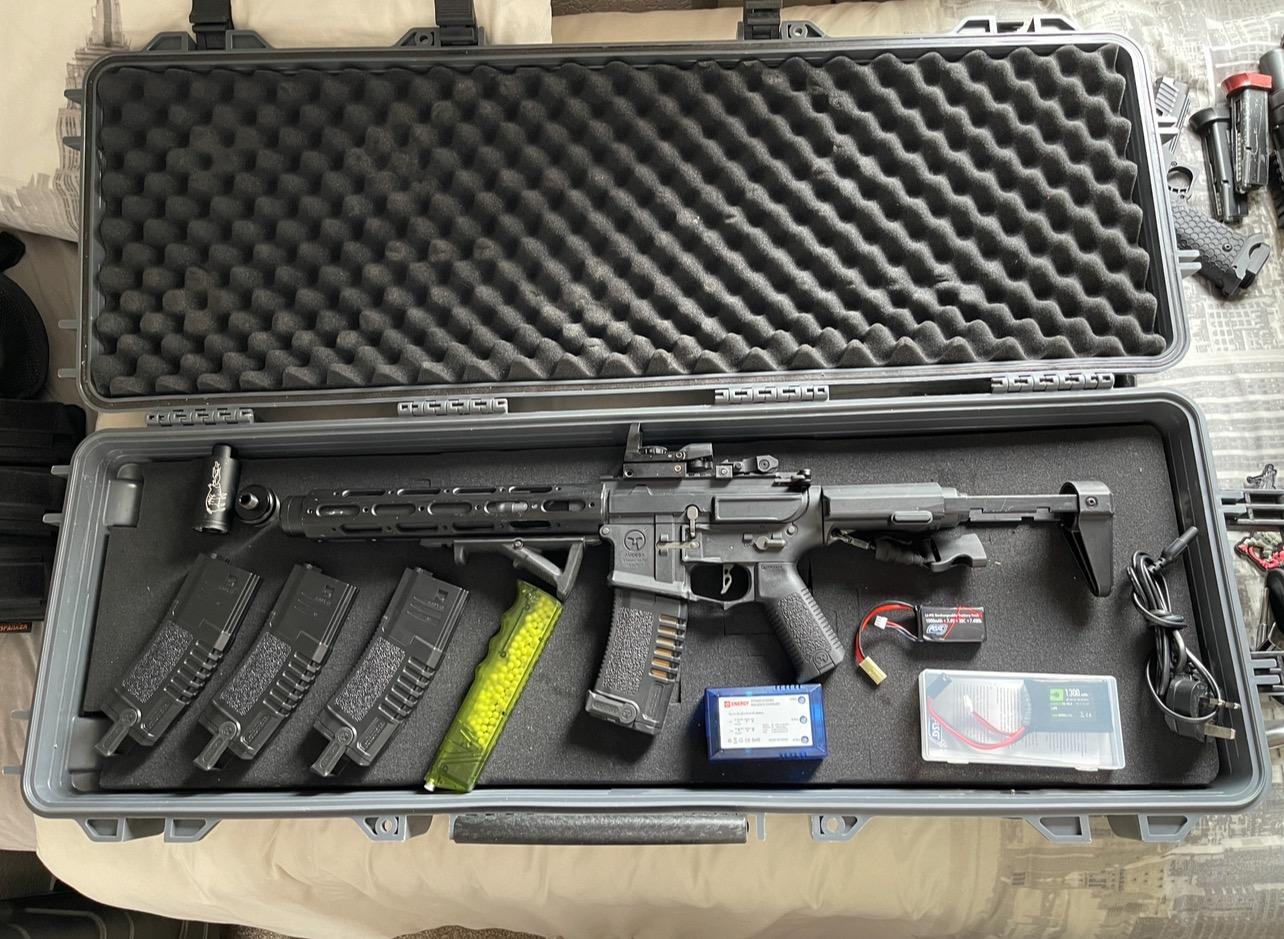 Attachments - - Fore grip - Reflex green / red dot site - with 4 interchangeable crosshairs. - CCW 14mm thread adapter for attaching tracer units / mock suppressor - original internal suppressor cap - 3 point sling - 3 120 rnd midcap mags - 1 250 rnd high