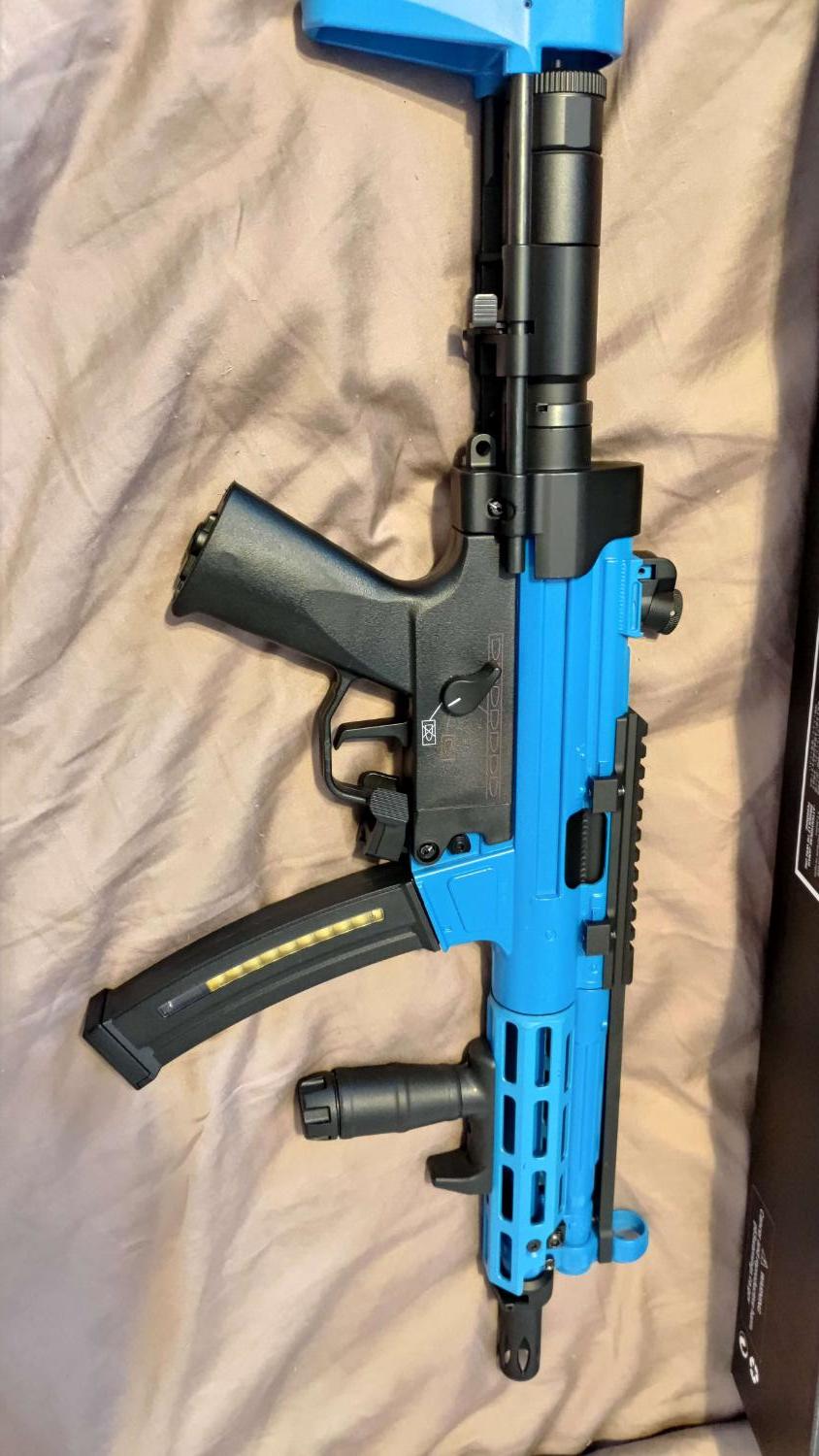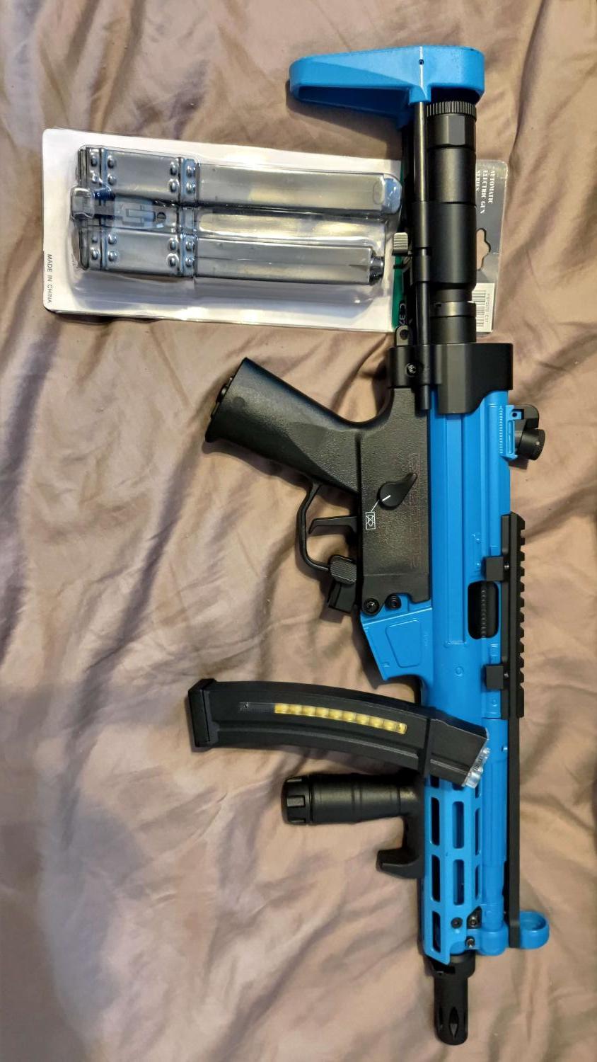 Brand new never used except firing once to test battery. Comes with 1 standard mag (130 rnd) and 1 hi cap (570rnd) mag (Battery not inc). Originally £319.99 with just the gun itself but I am selling for £270 (overnight courier cost included) with the hi cap mag. See Patrol Base for stats (https://www.patrolbase.co.uk/cyma-cm-041g-upgraded-version) want to sell this as I have a couple of other guns I prefer now.