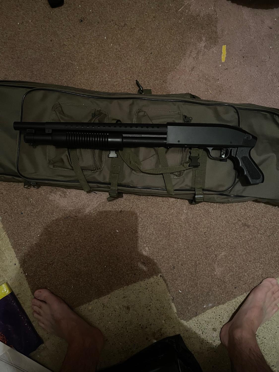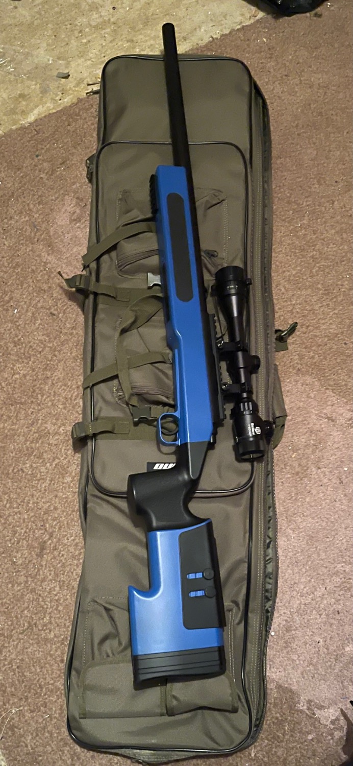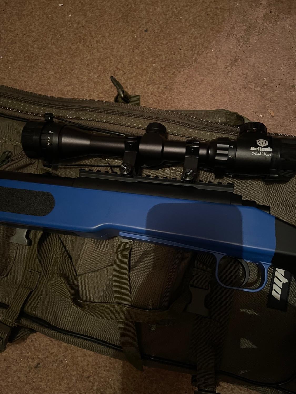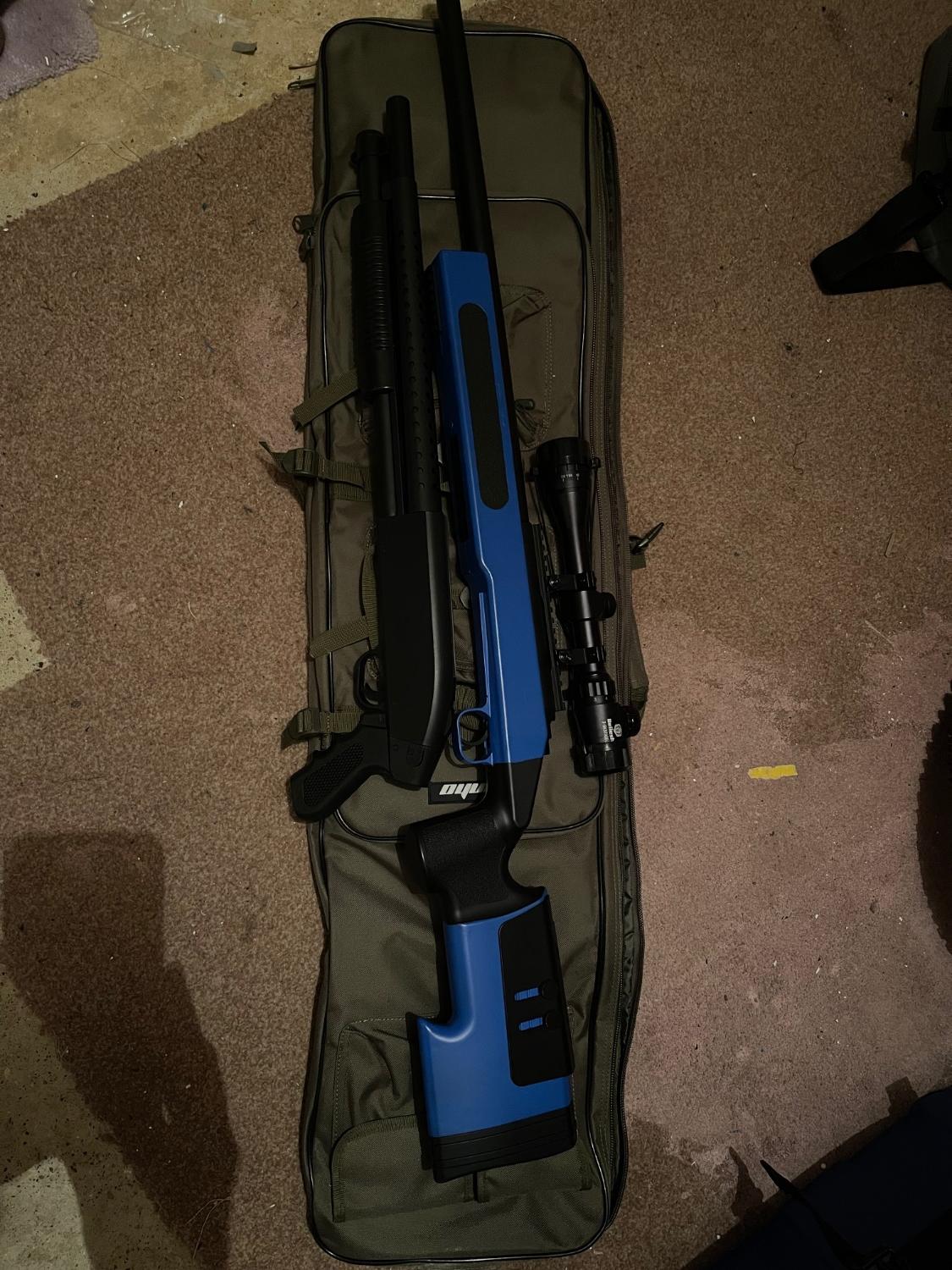 Comes with 3 mags, 3-9x32 illuminated scope (brand new), soft carry case, AGM NO.003A single shot pump action shot gun (in black, literally never skirmished) and a bottle of 0.3g BBs.