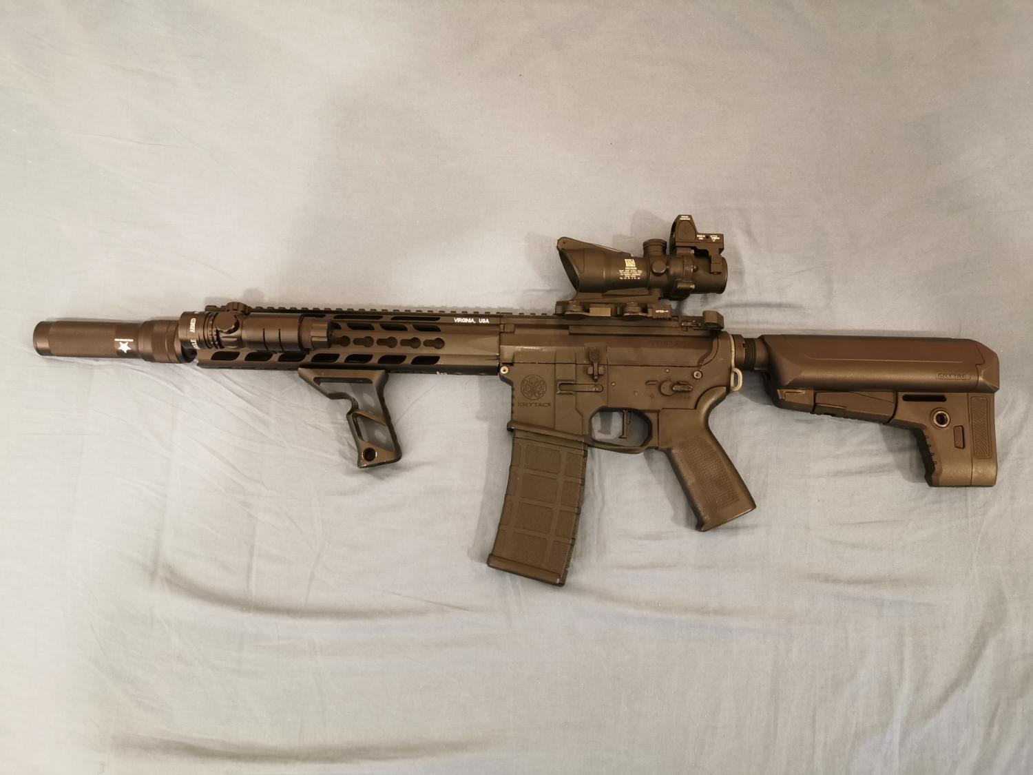 Fit m4 with barrel extended out of handguard as well (a 1 inch barrel extension was fitted to this CRB in picture to allow the silencer to be fitted, it will fit nicely to a spr version of the Krytac without barrel extension)