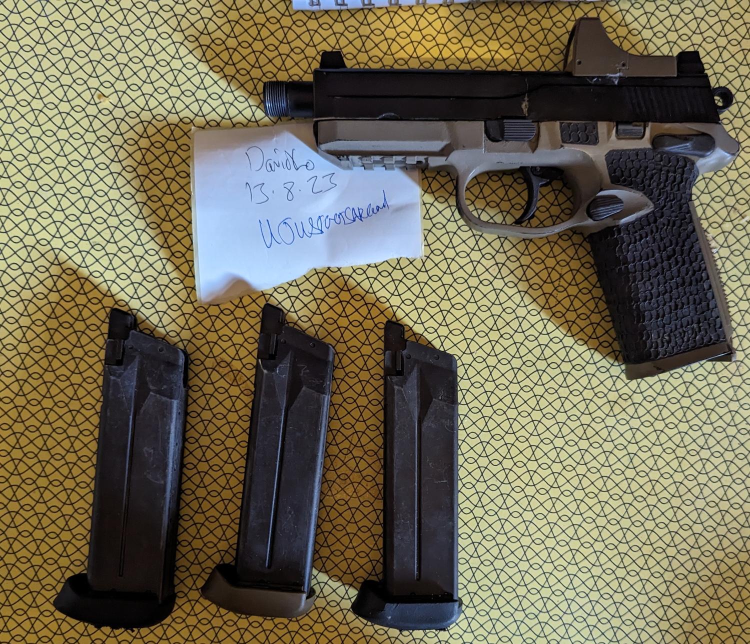 TM fnx, has a crack on the left hand slide, has apoxy in it, but obviously it's a cracked slide. Also the red dot has been glued on to the slide as well.