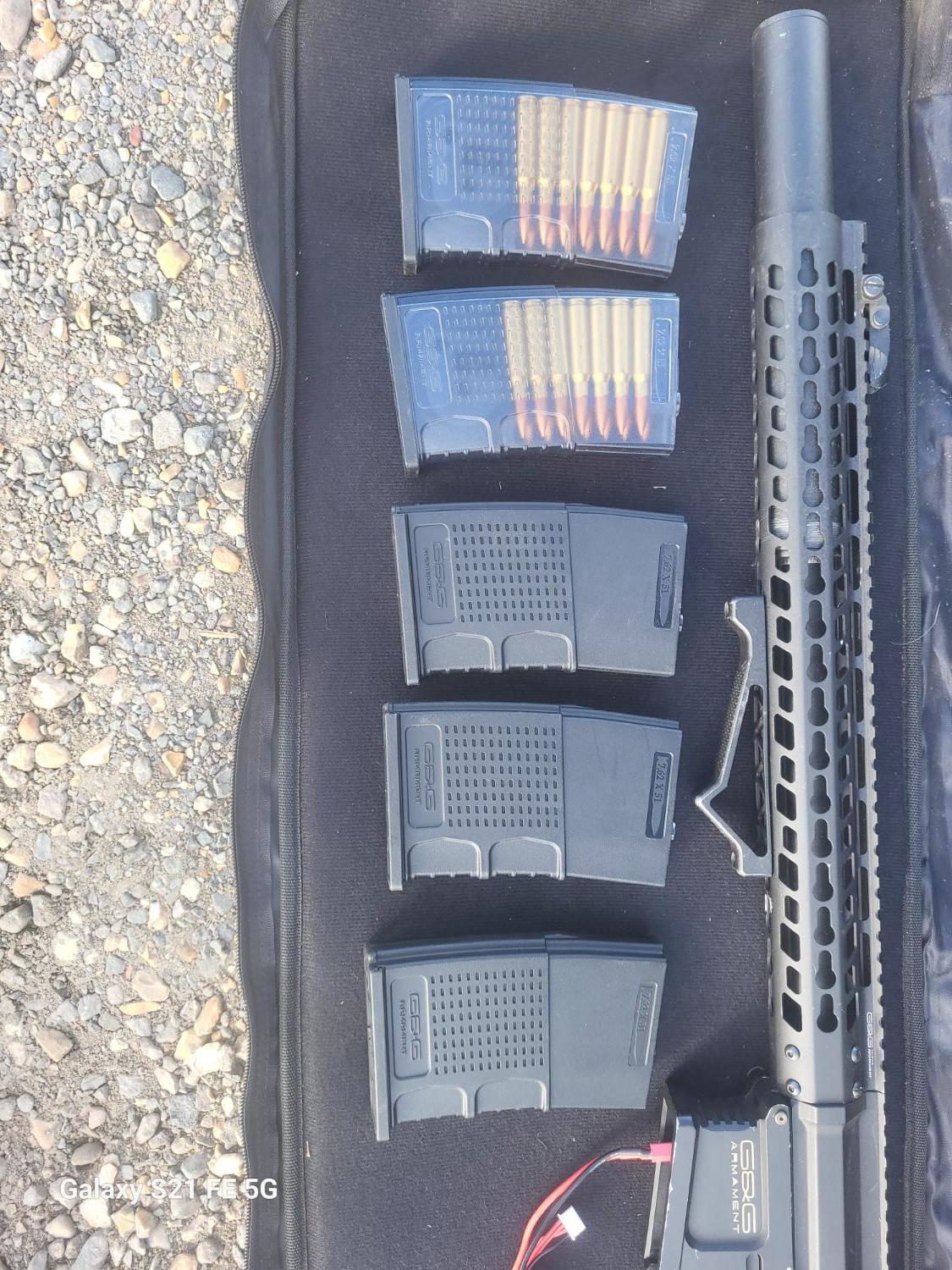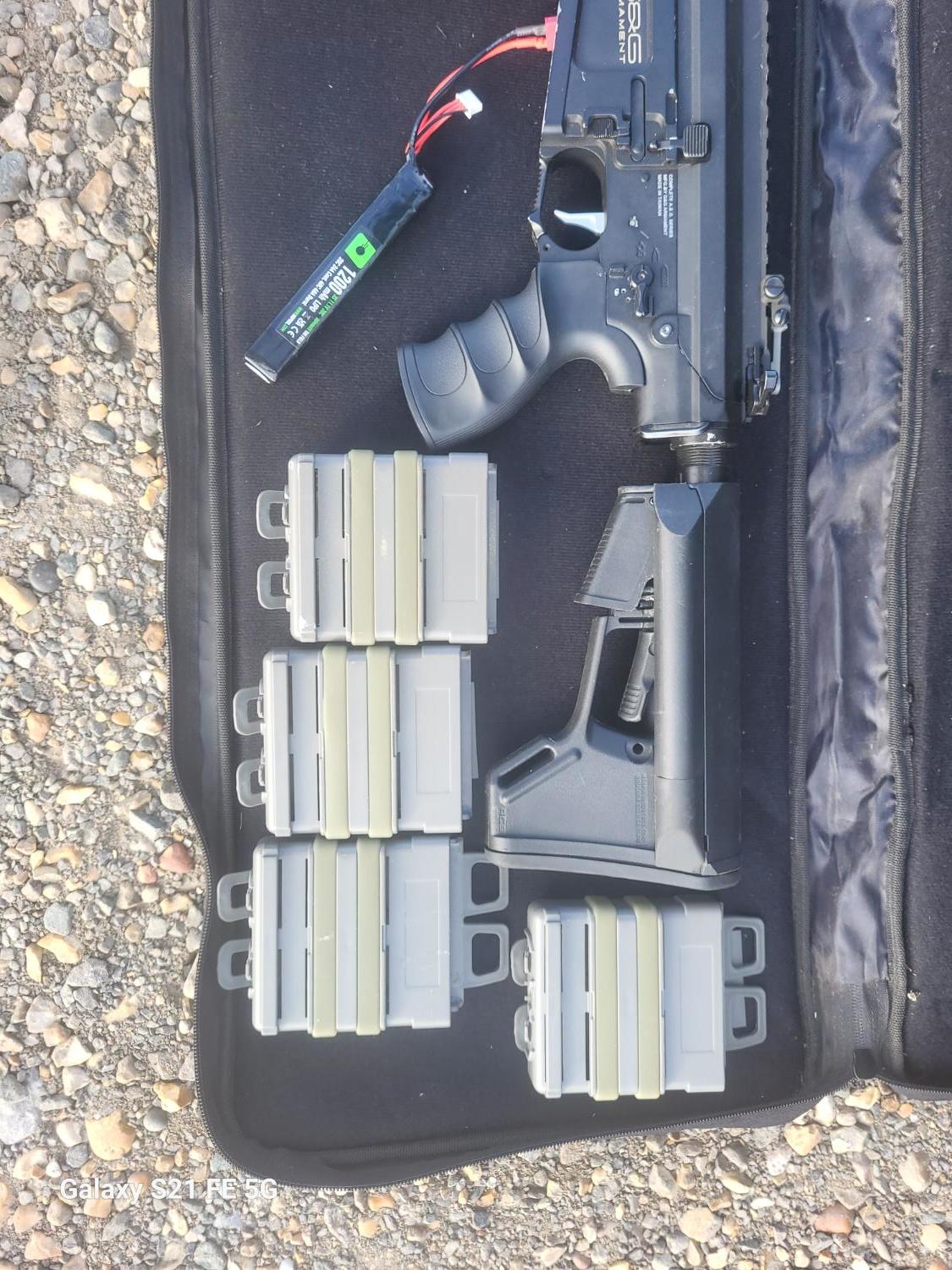 5 mags, 3 x high caps and 2 x 40 ish round mags. 4 x mag pouches