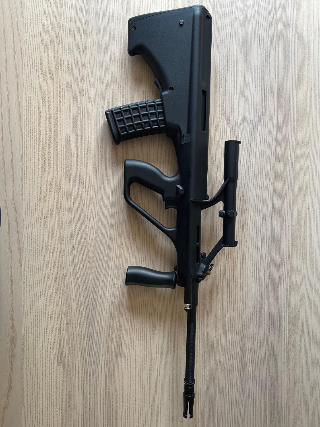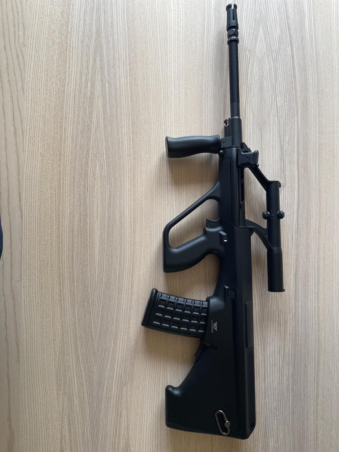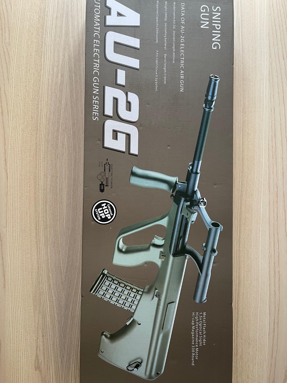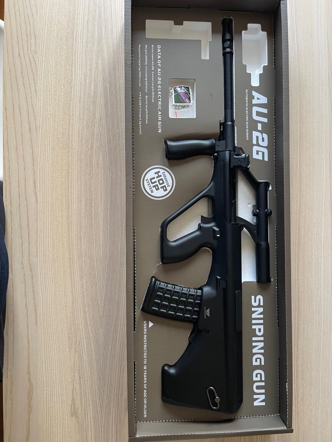 JG AUG AU-2G AEG in black. Comes in original box with 1 x high cap magazine and cleaning rod. This particular model is fitted with an integral 1.5 x zoom scope.