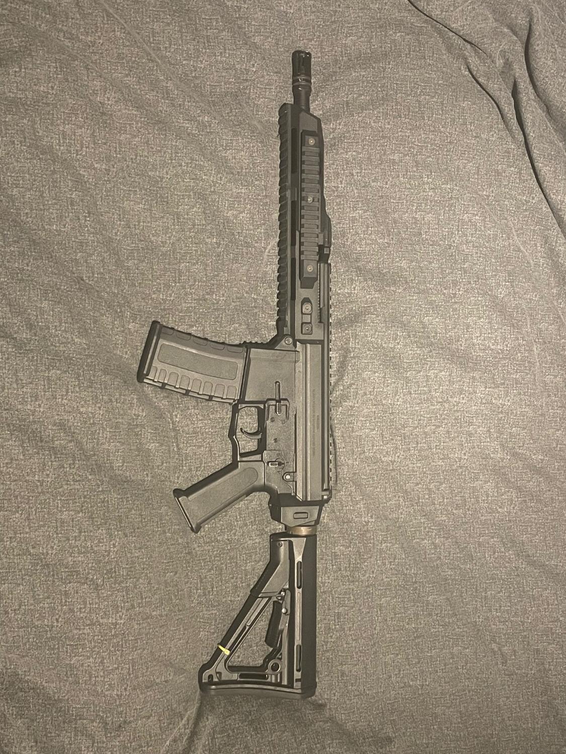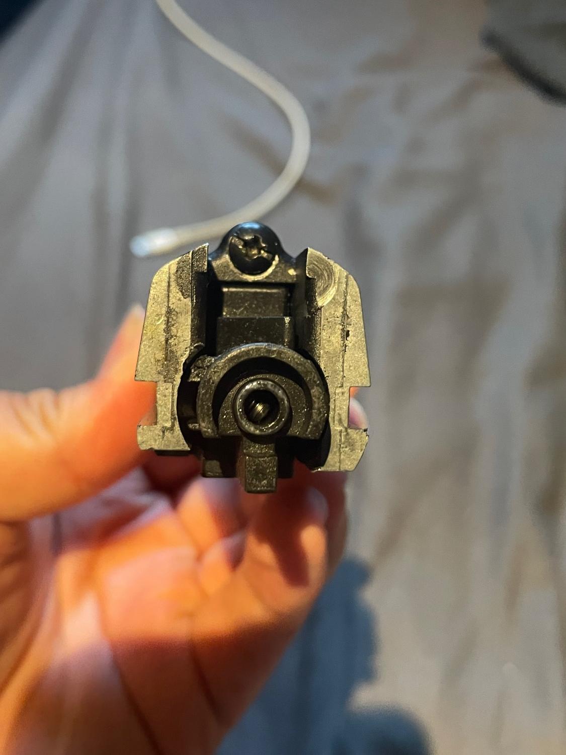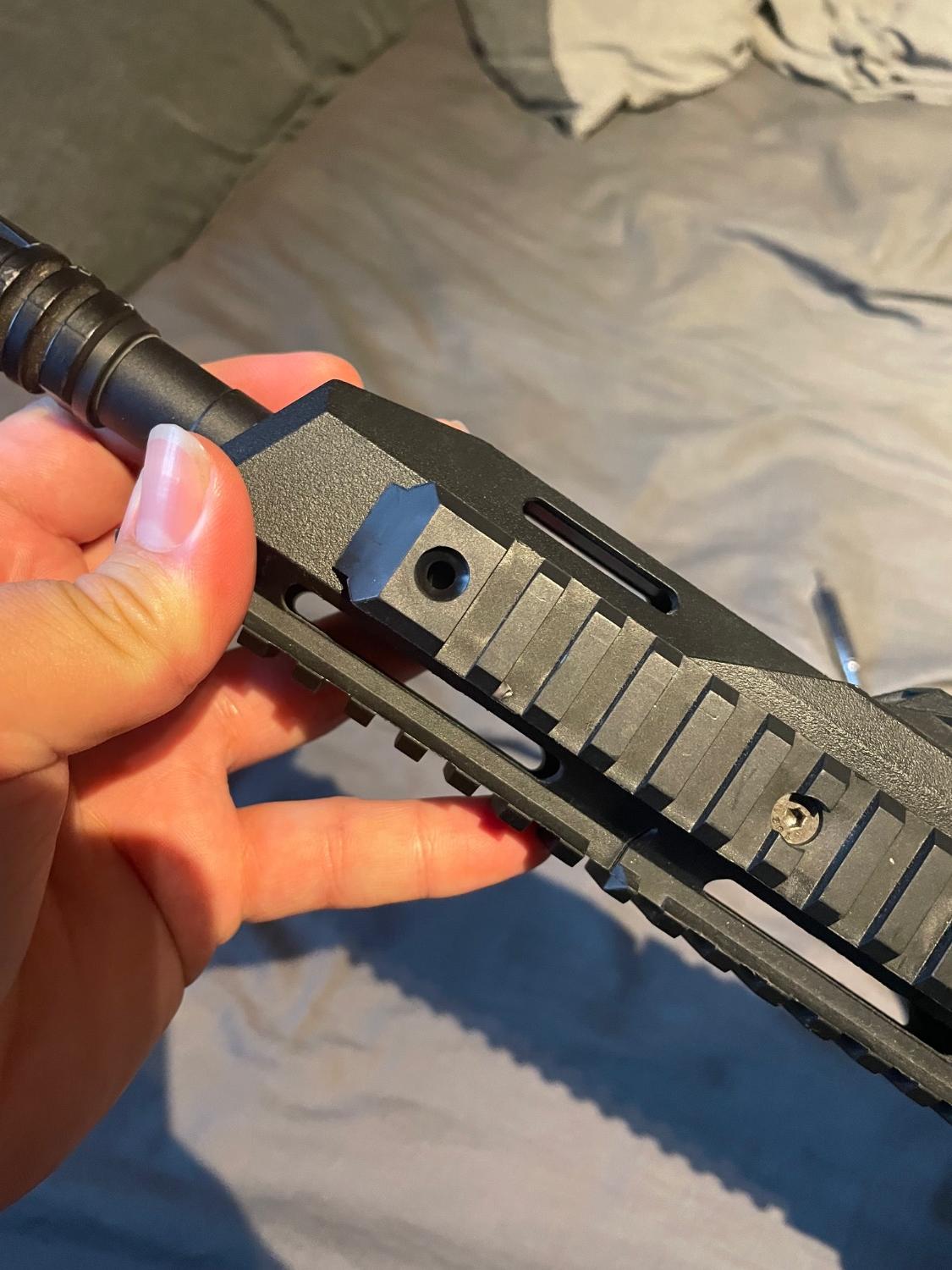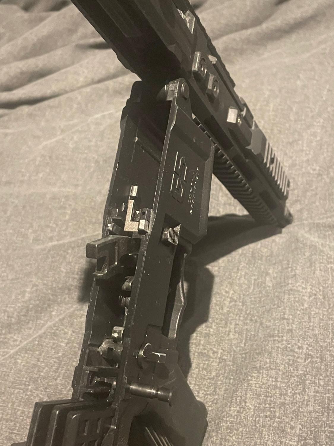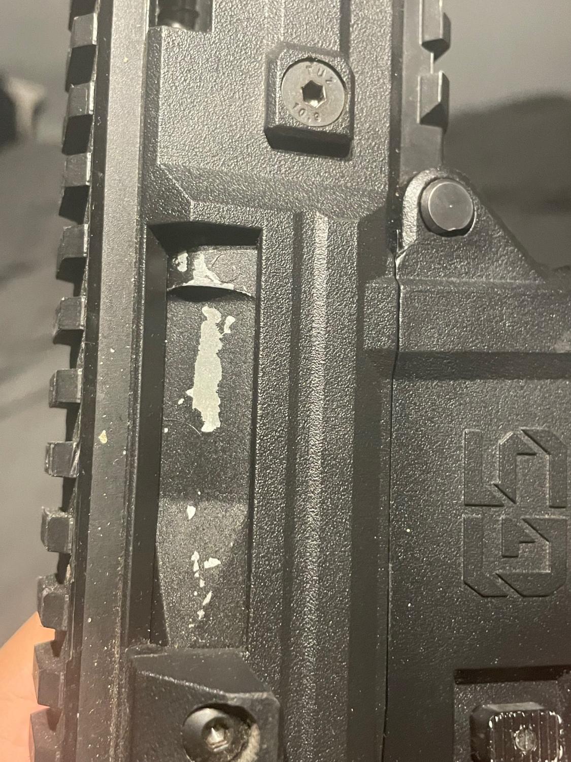 Cosmetically a few scuff and scratches to the metal parts, mainly the bolt carrier. When I purchased this a mod was done to make the fps adjustable which is a small grub screw inside the nozzle as this was firing hot, this was not done by myself. There is 1 x screw and nut missing from the handguard (there is 3 on each side). some slight wear on the block chamber from the grub screw protruding.