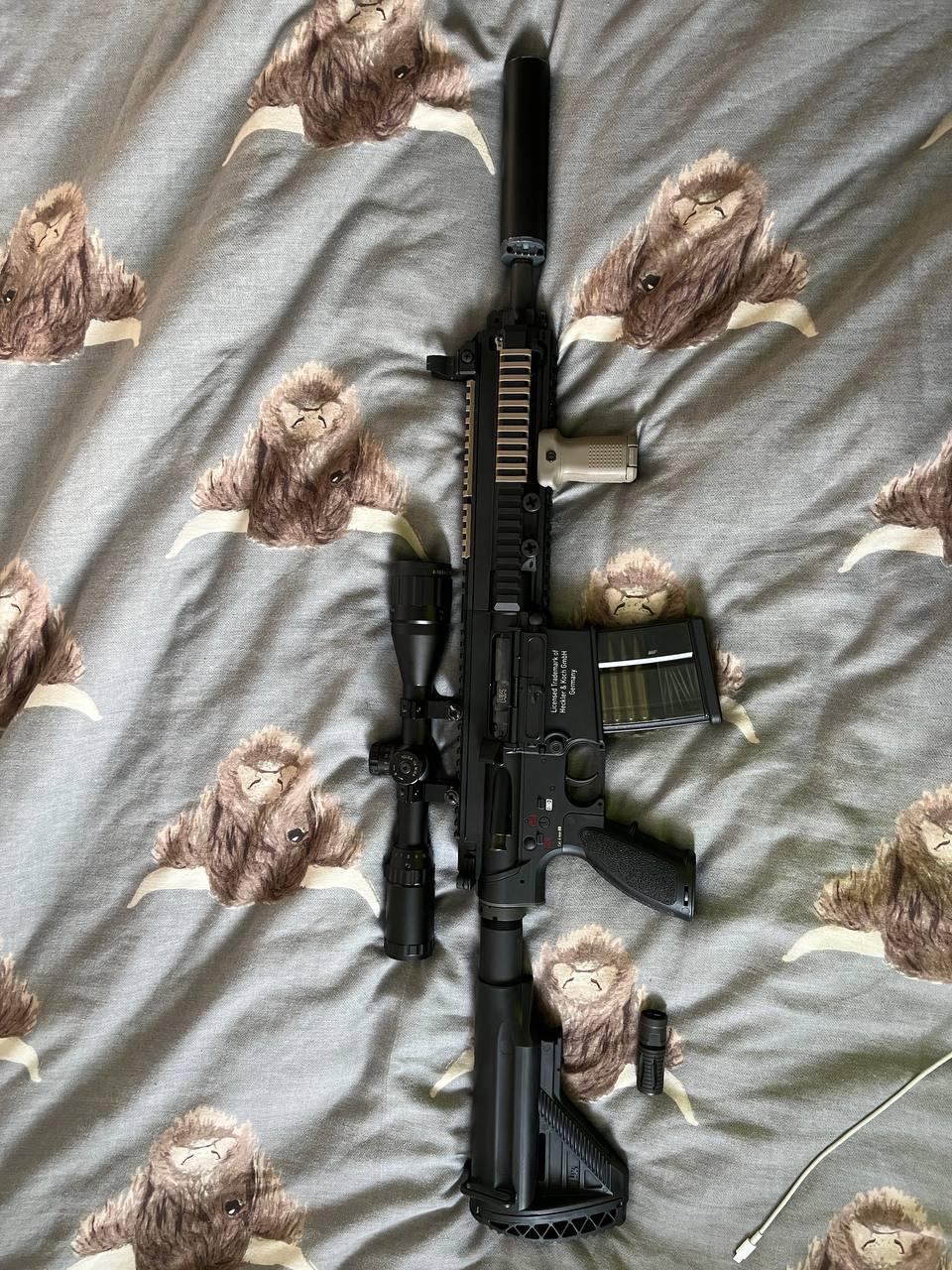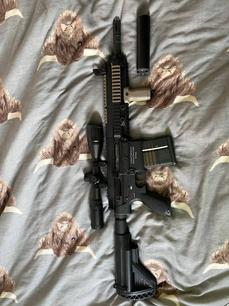 mag, scope, foregrip, rail covers, Harris style bipod