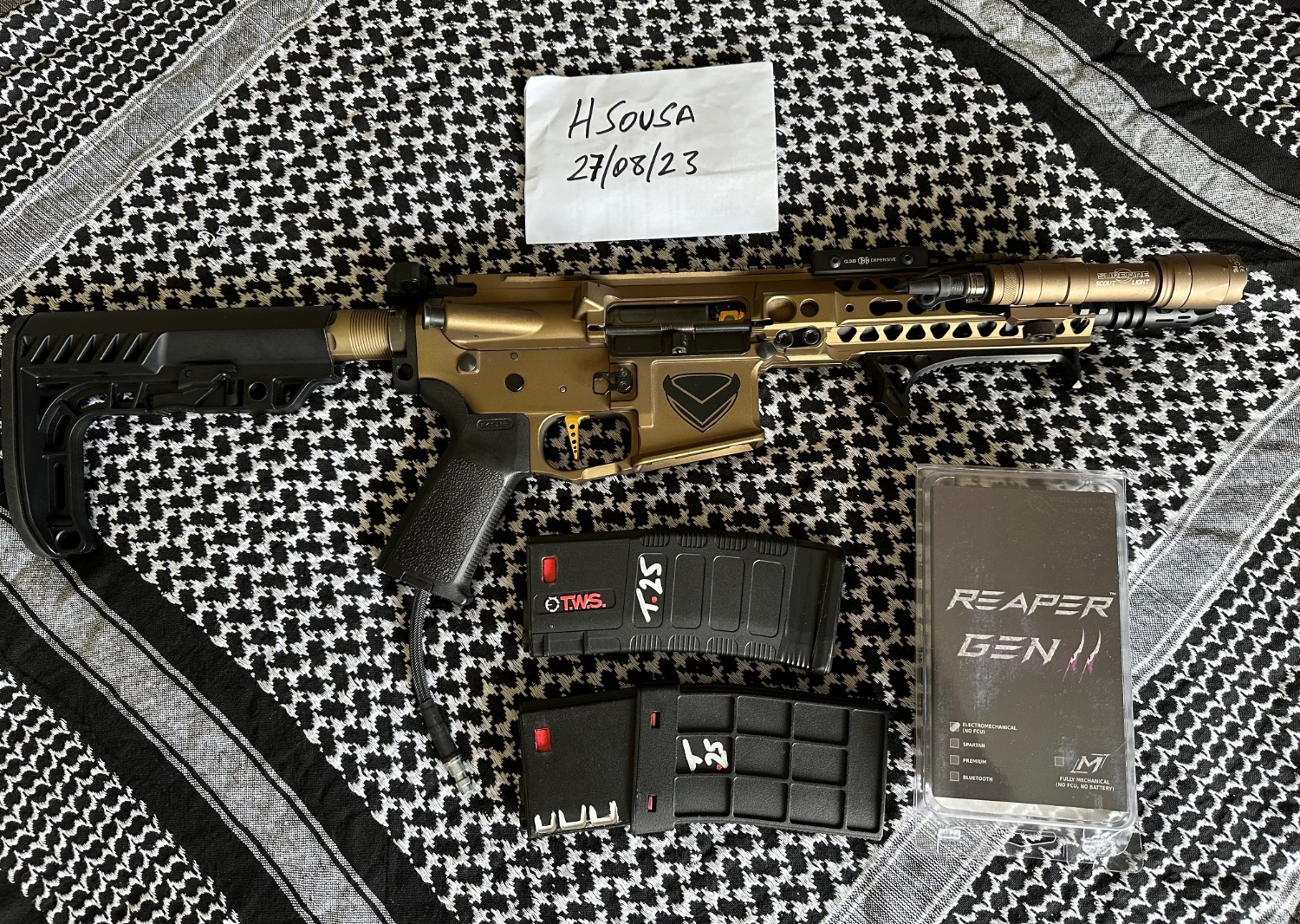 HPA build, it’s a Burnt Bronze cerakoted G&P , it’s got a Wolverine Reaper Gen II electromechanical engine, surefire rep torch and pad , gold Maxx Pro Hopup , I think it’s got a PDI tight bore barrel, gold speed trigger and upgraded Braided Grip line. Shoots semi only, 2x hi-cap mags , Magpul MOE grip with some nice Upgraded external parts. Used 3 times since building it.