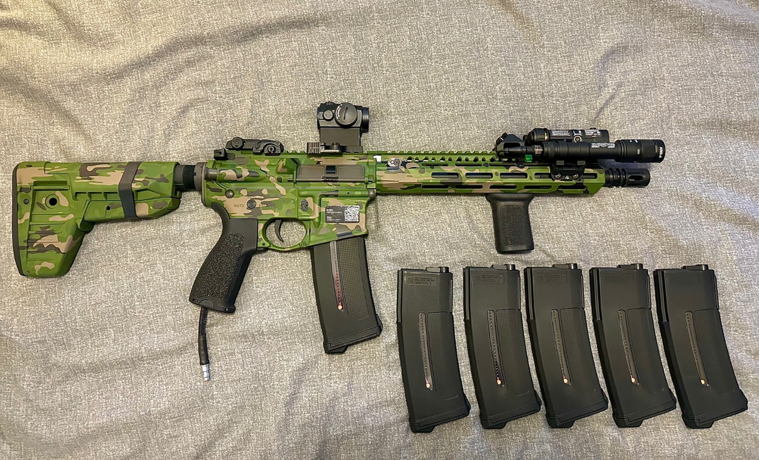 All attachments pictured are included + extras: Holy warrior T1 with mount, BCM gunfighter grip, Brand new still packaged Maxx high spreed trigger, WADSN NGAL (metal version), WADSN surefire torch, WADSN hot button, Magpul BUIS. I can also provide a 48cl tank with regulator, battery and line for a little extra ££.