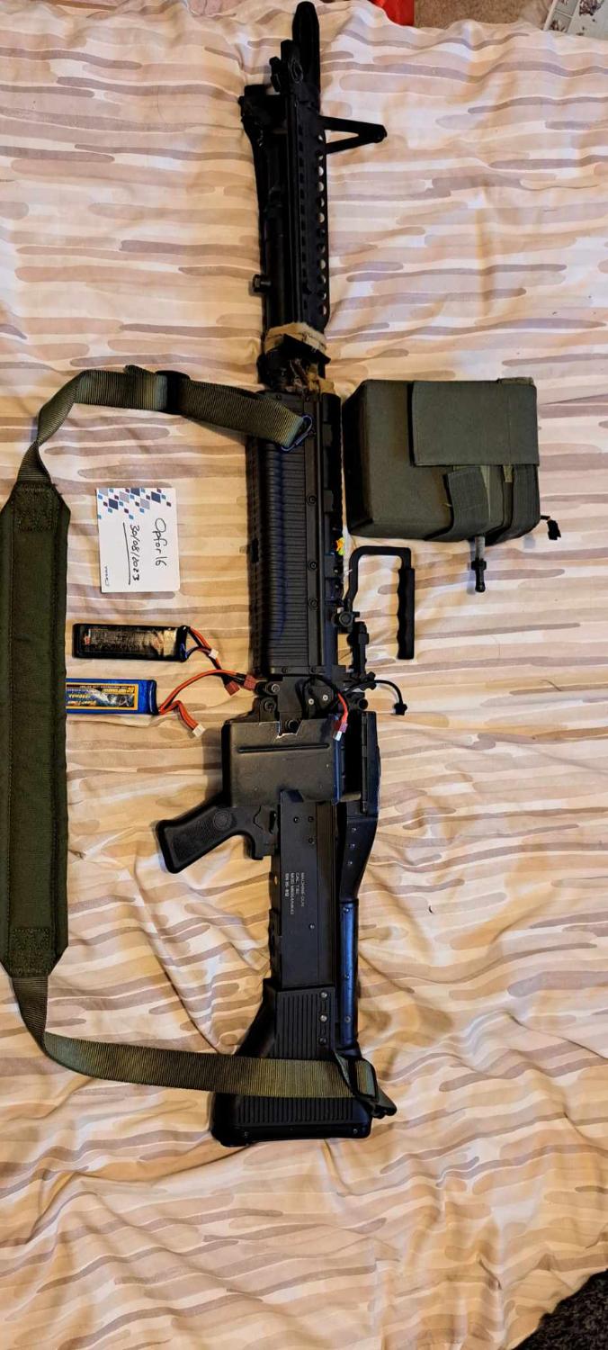 For sale is my A&K M60VN, it comes with a padded sling, 2 batteries, box magazine and a 3d printed steel reinforced box mag plate mount (see photo, original ones were notorious for breaking) This gun has some wear and tear from use, the front right bipod mount has chipped off one of the locking blocks meaning the right hand bipod swings forward however I have previously rigged a quick release mechanism from some old DPM that works fine to hold it. The plastic tube around the box mag feed tube has some wear and tear but still works fine. Had to replace some of the original screws on the side of the gun with some other ones as the originals were poorly made and unscrew themselves. I have had a lot of fun with this gun over the years but have decided its time to sell it, it can be a bit tricky to get going when setting up, but once it goes, it doesn't stop. If you have any questions or query's please don't hesitate to ask, I am willing to ship for extra cost but since its a big heavy gun it won't be cheap.