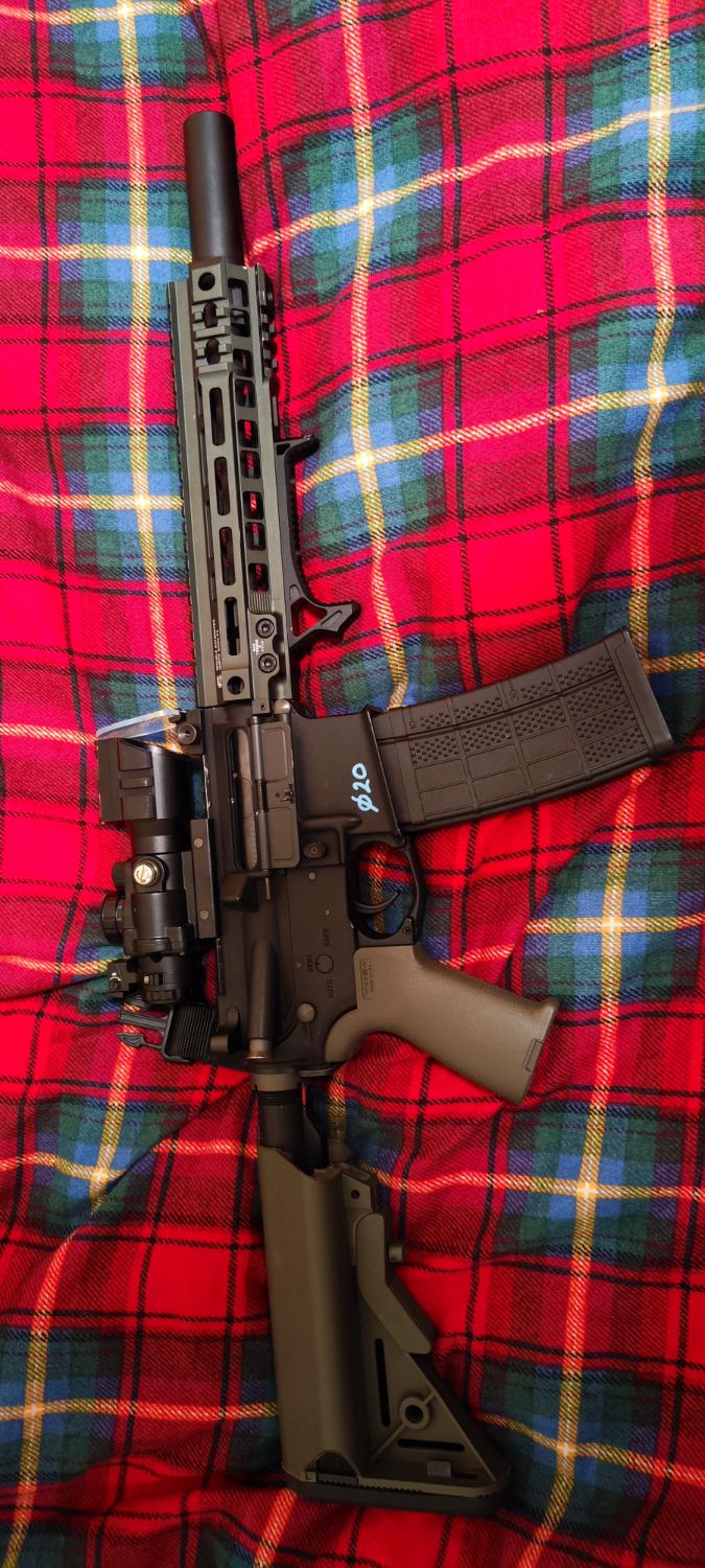 Built using the excellent KWA RM4 platform, by adding this Beautiful dark green 9.5" Gisele rail, green Magpul MOE pistol grip and green stock.