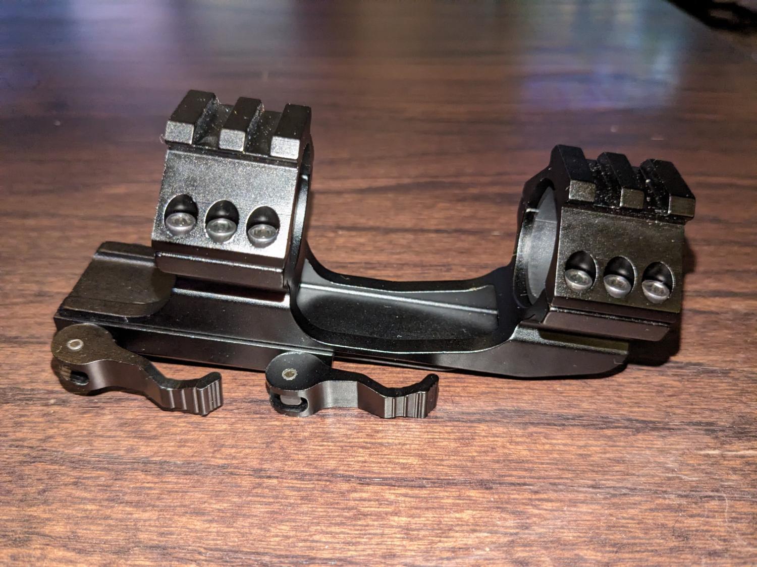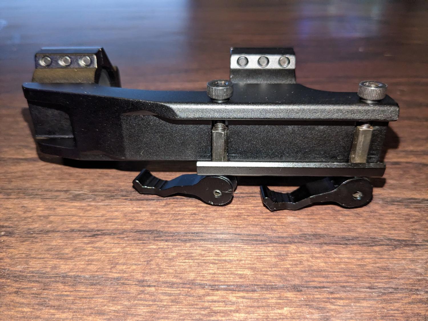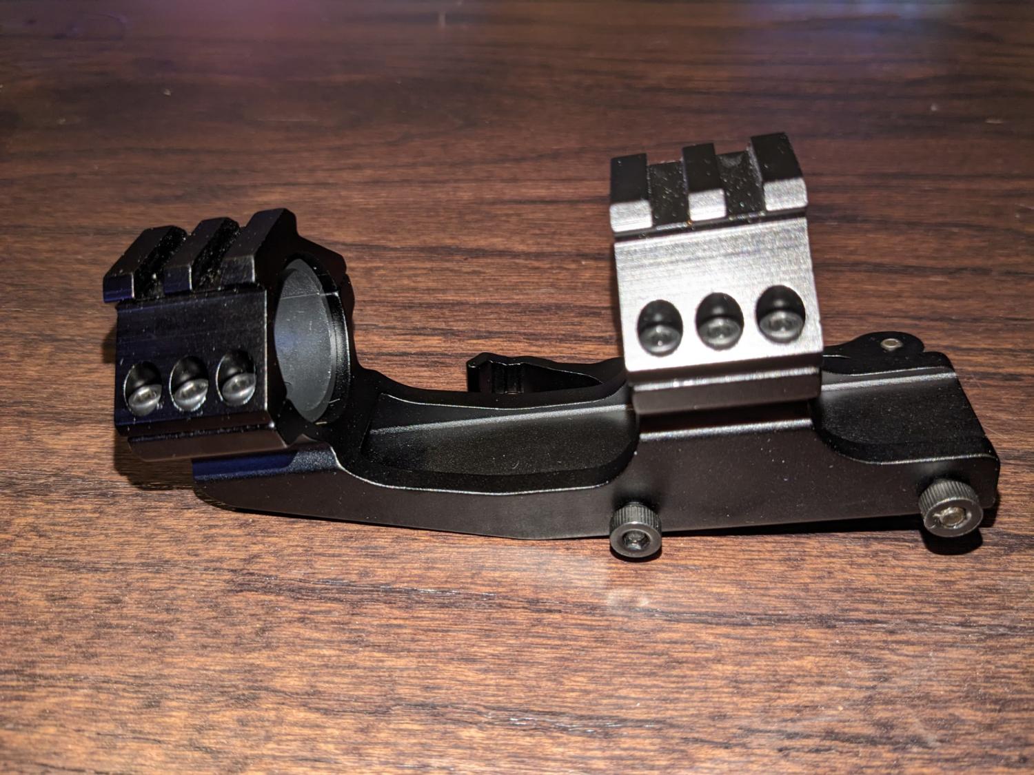 Cantilever style scope mount. 20mm RIS with quick release attachment, also has 2 small RIS sections on the top of the clamps for mounting small red dot etc. 30mm rings but supplied with spacers to take it down to 25mm. As new condition, unsure of brand as it has no markings.