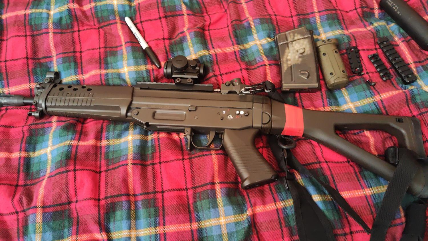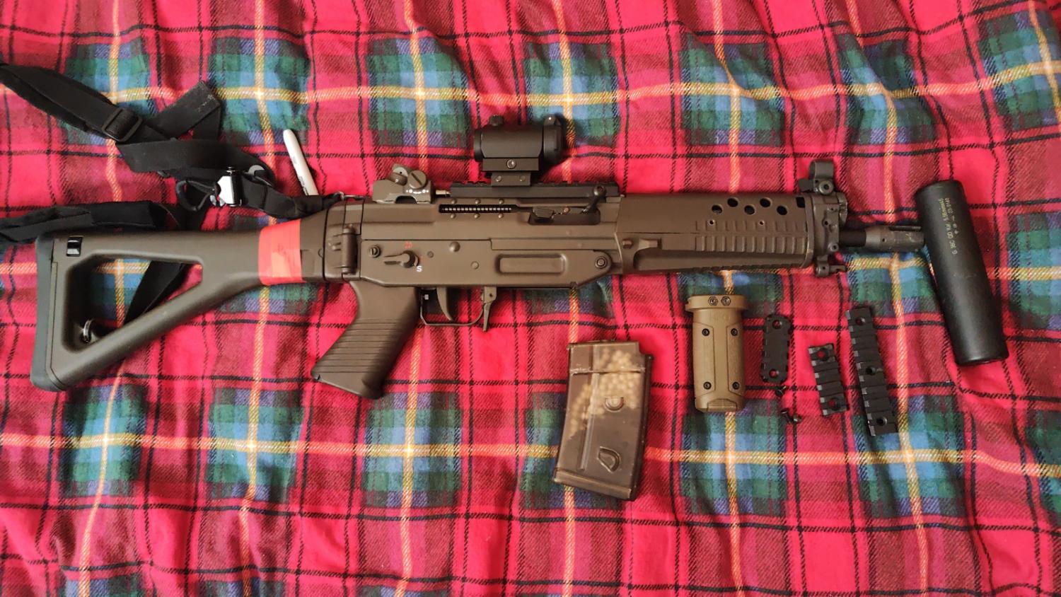 G&g Sig 552 upgraded with gate titan so made to have a very sensitive trigger. Stamped steel receiver adds very nice weight while also being small enough to carry easy. Works great on semi with a 7.4 but obviously can work better on an 11.1 if you prefer. Will come with 3 rails that fit around the hanguard, a vertical grip and one high cap mag.