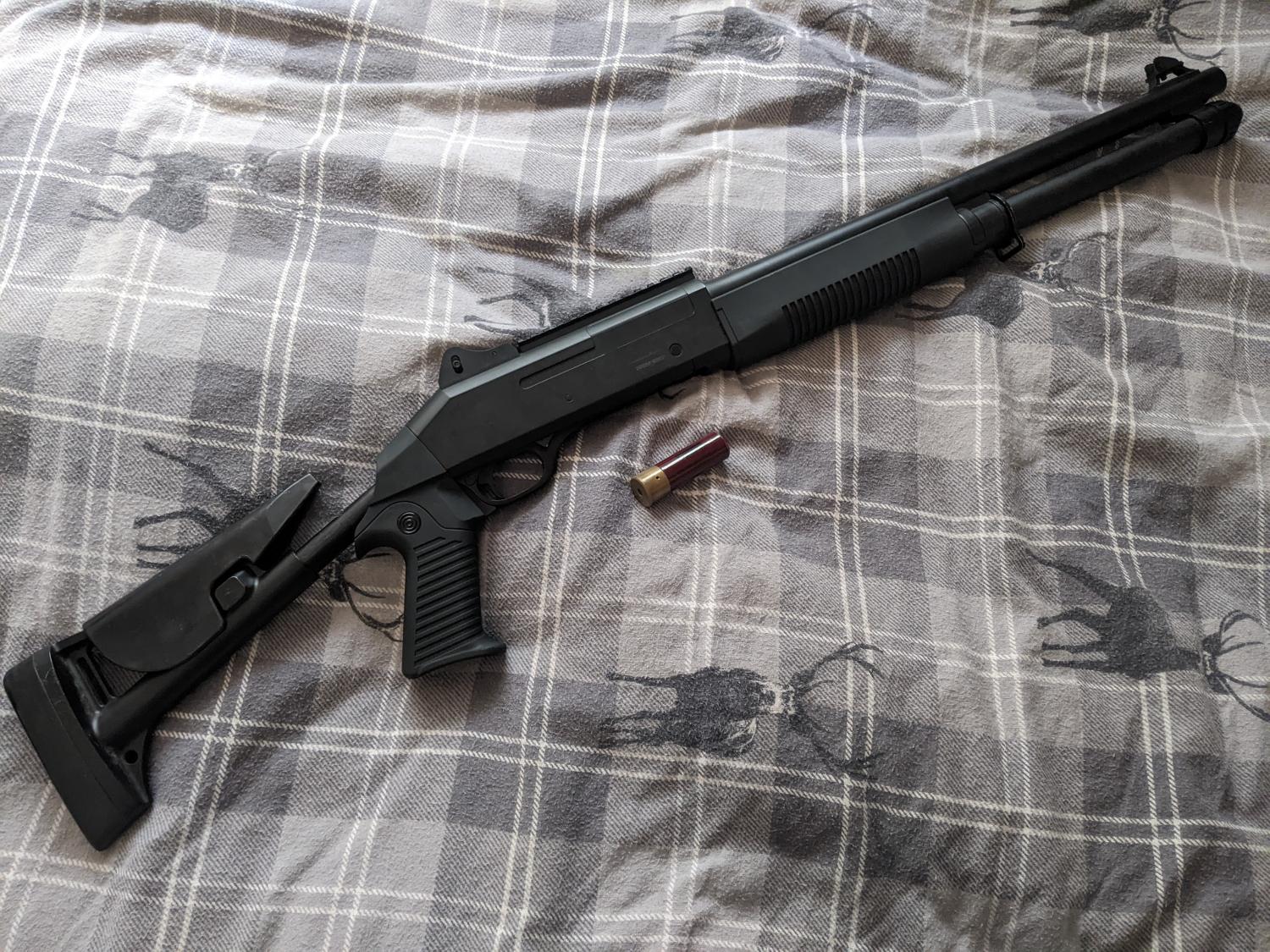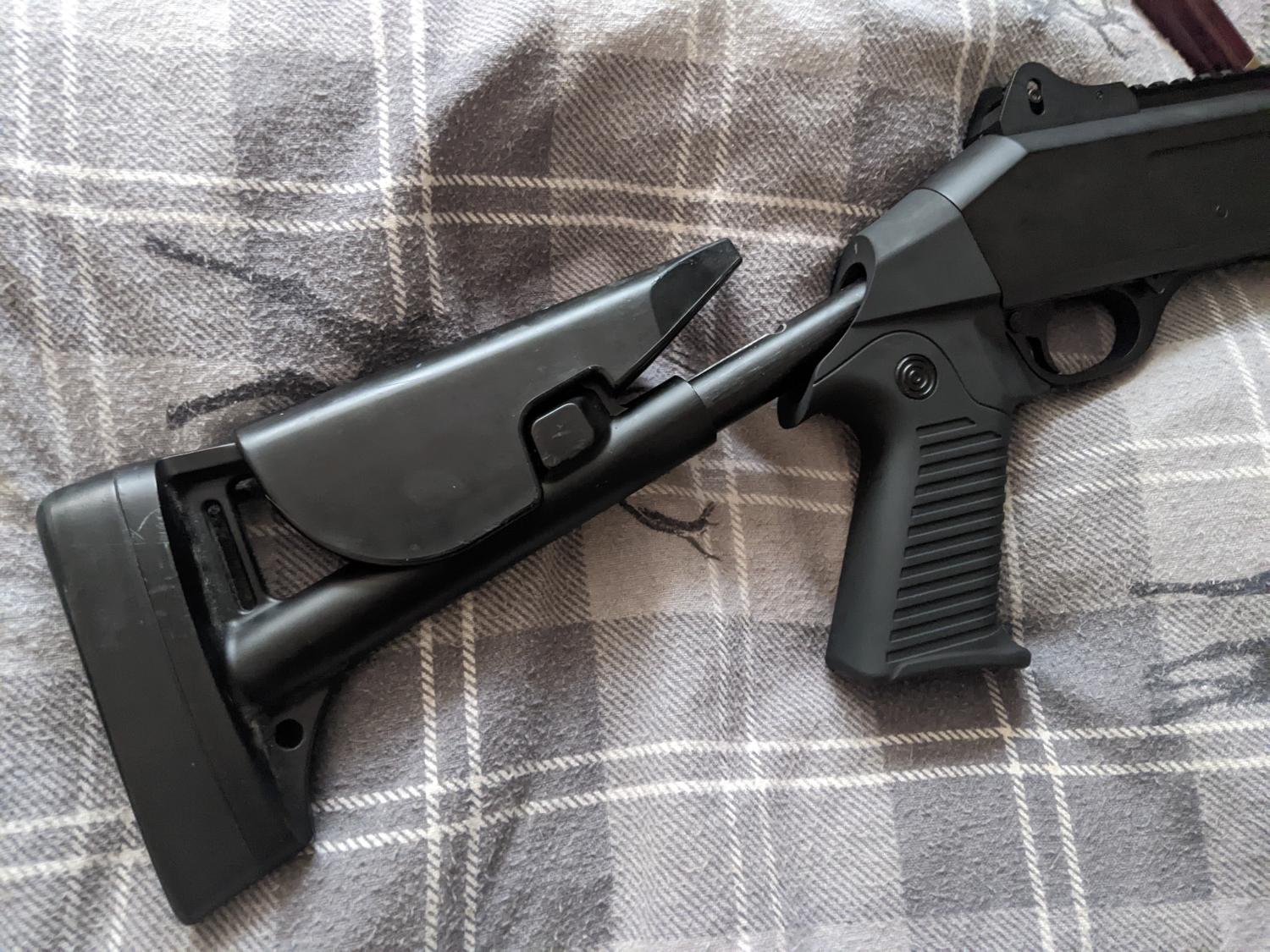Brilliant tri-shot shotgun from Double Eagle, spring powered and uses 30rd shells. Tri-shot design so has three barrels with fix hopups. ABS body, stock and grips. Metal stock tube, outer barrel and under barrel. Shoots around 330FPS so is site legal, comes with 1x shell. Happy to post for £5.