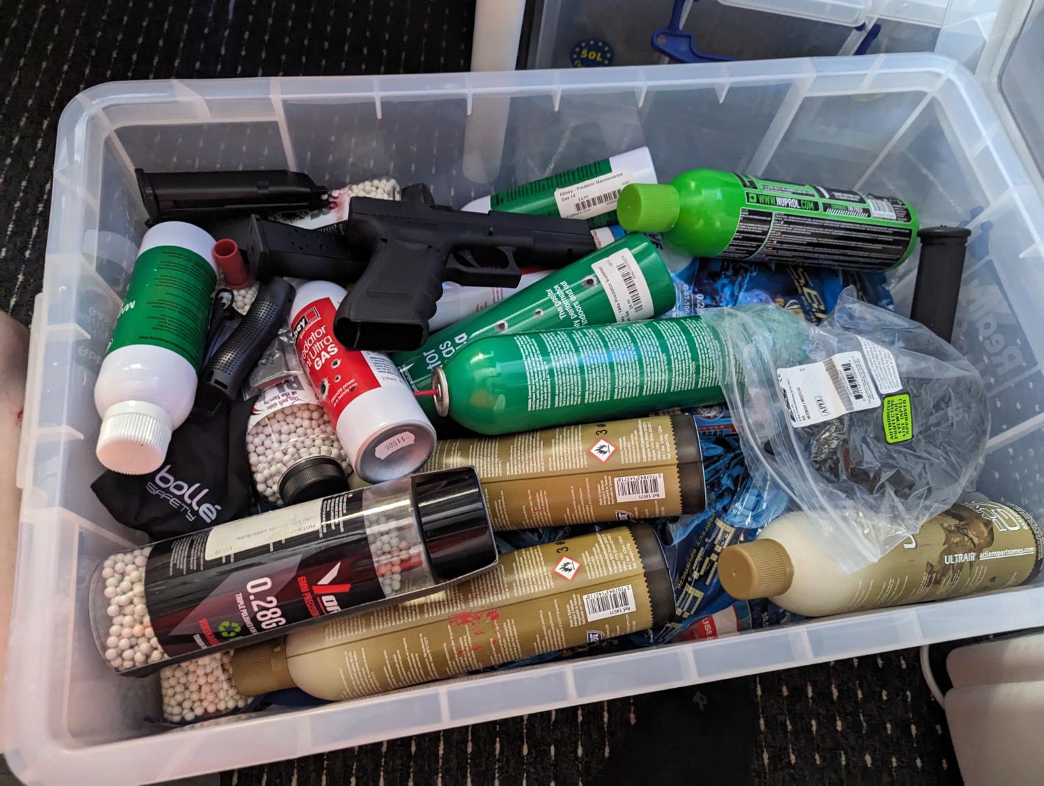 Bottles of gas and BBs some open and some new