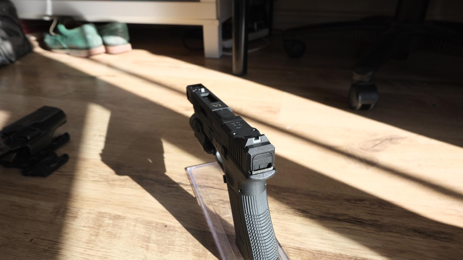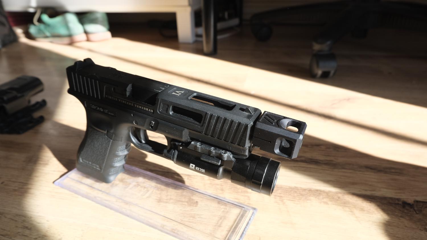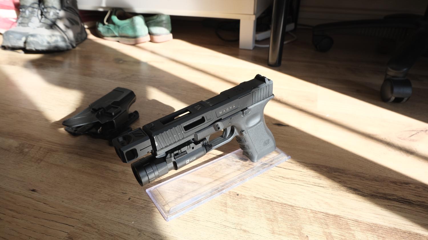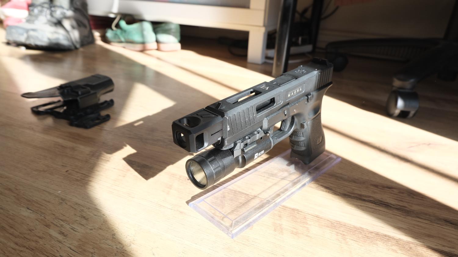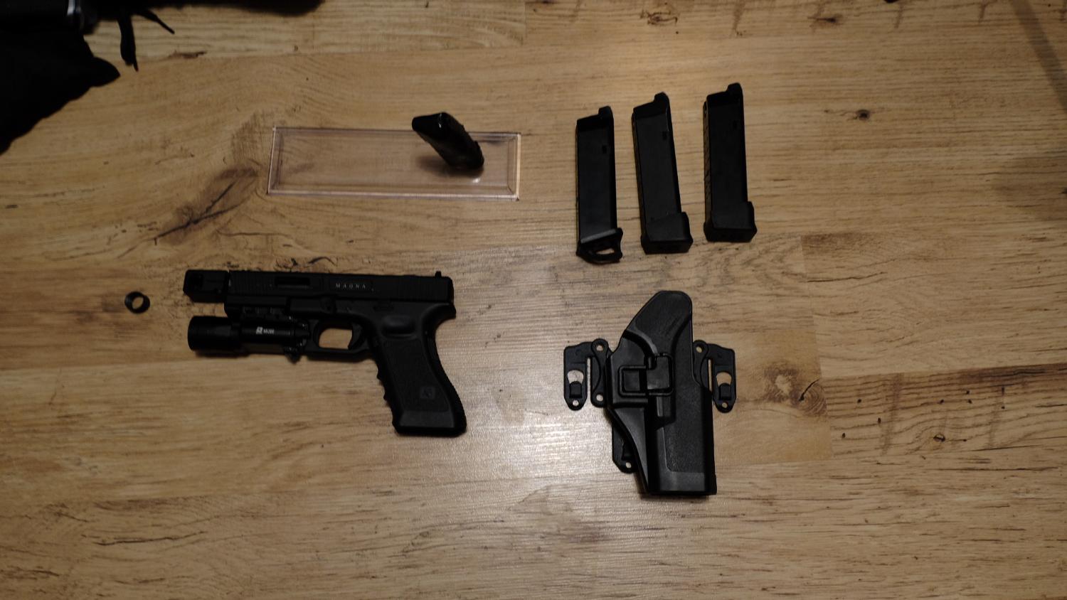 3 Mags, Holster, compensator, thread cover, Torch & stand