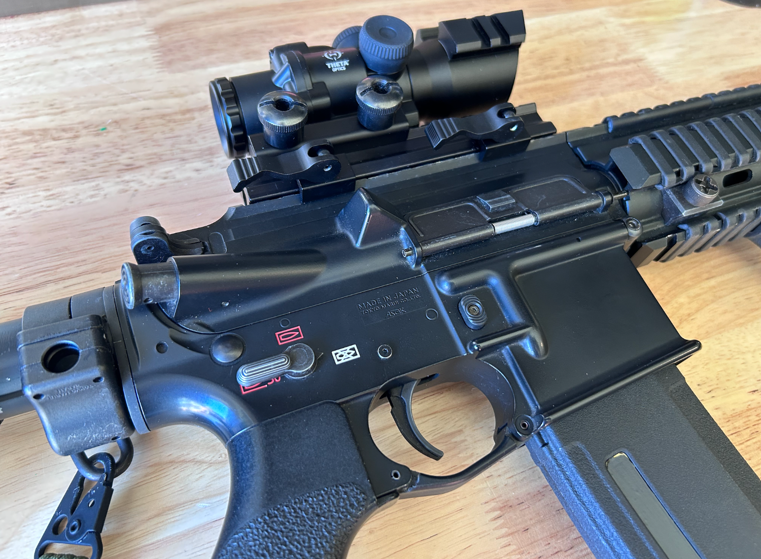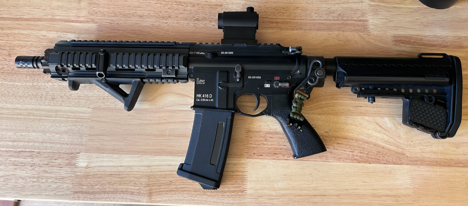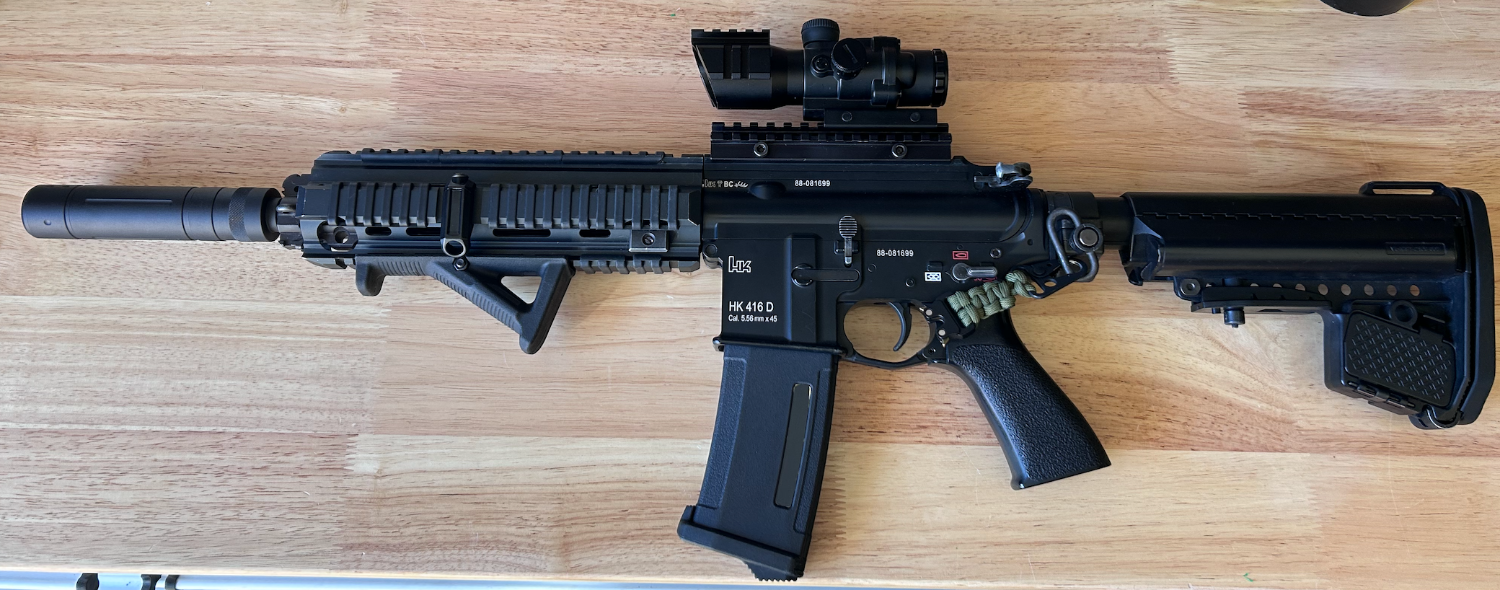 Accurate, fast and reliable Tokyo Marui HK416 – displayed with CQB setup (flash eliminator / Aimpoint) and more stand-off orientated (suppressor / ACOG). Fitted with Titan GATE V2 NGRS Expert – allows you to configure RIF for MILSIM events (ROF aligned with actual HK416 speed, limit magazines to 30 rounds, activate bolt release for reloads, pre-cocking for more realistic trigger response) or if that’s not your thing, two stage trigger (semi to burst in a single pull), increased ROF, reprogramme selector switch and many more options available using USB link to GCS app (Mac or PC). Consistently delivering 325 fps with 0.25s.