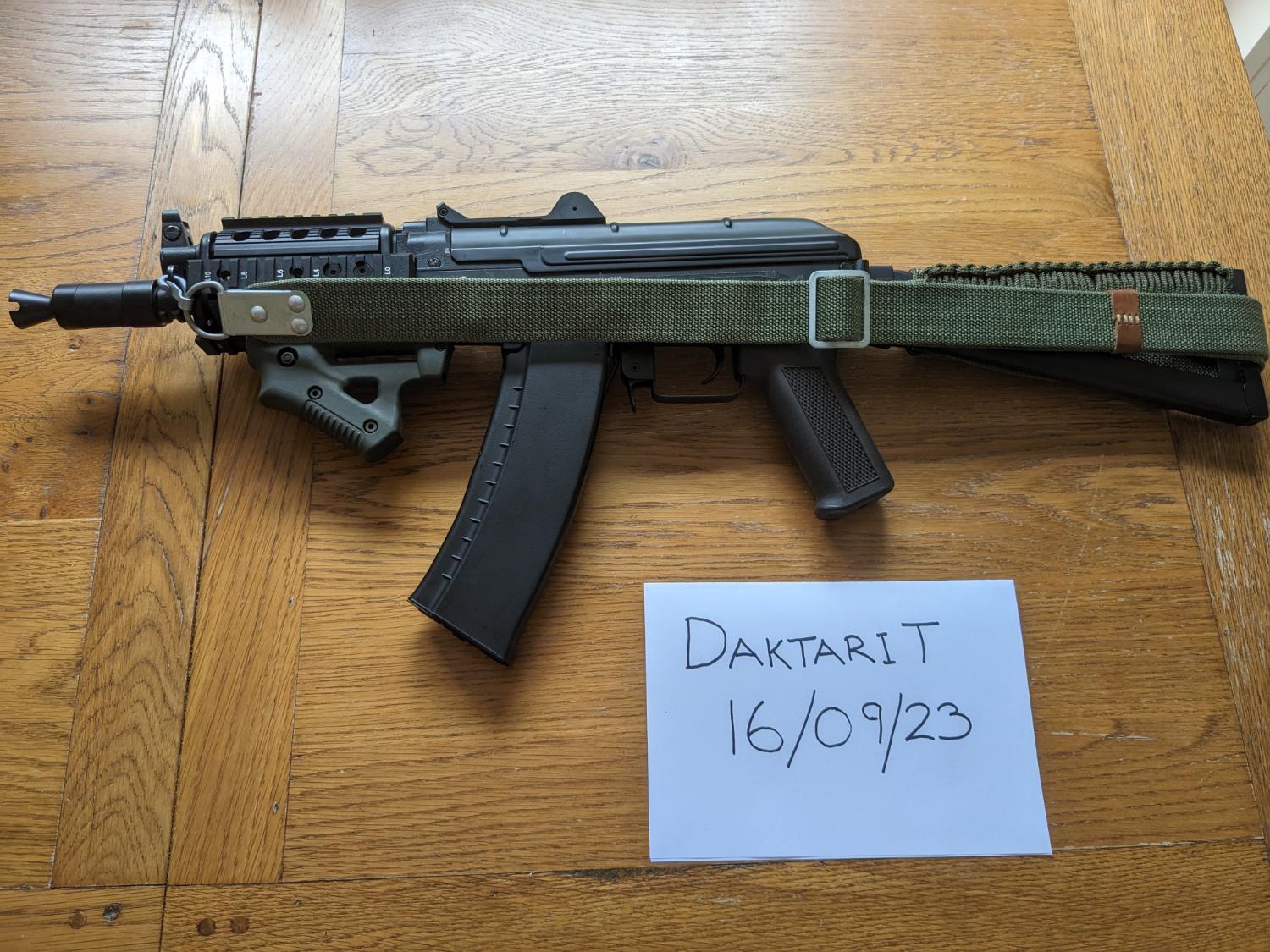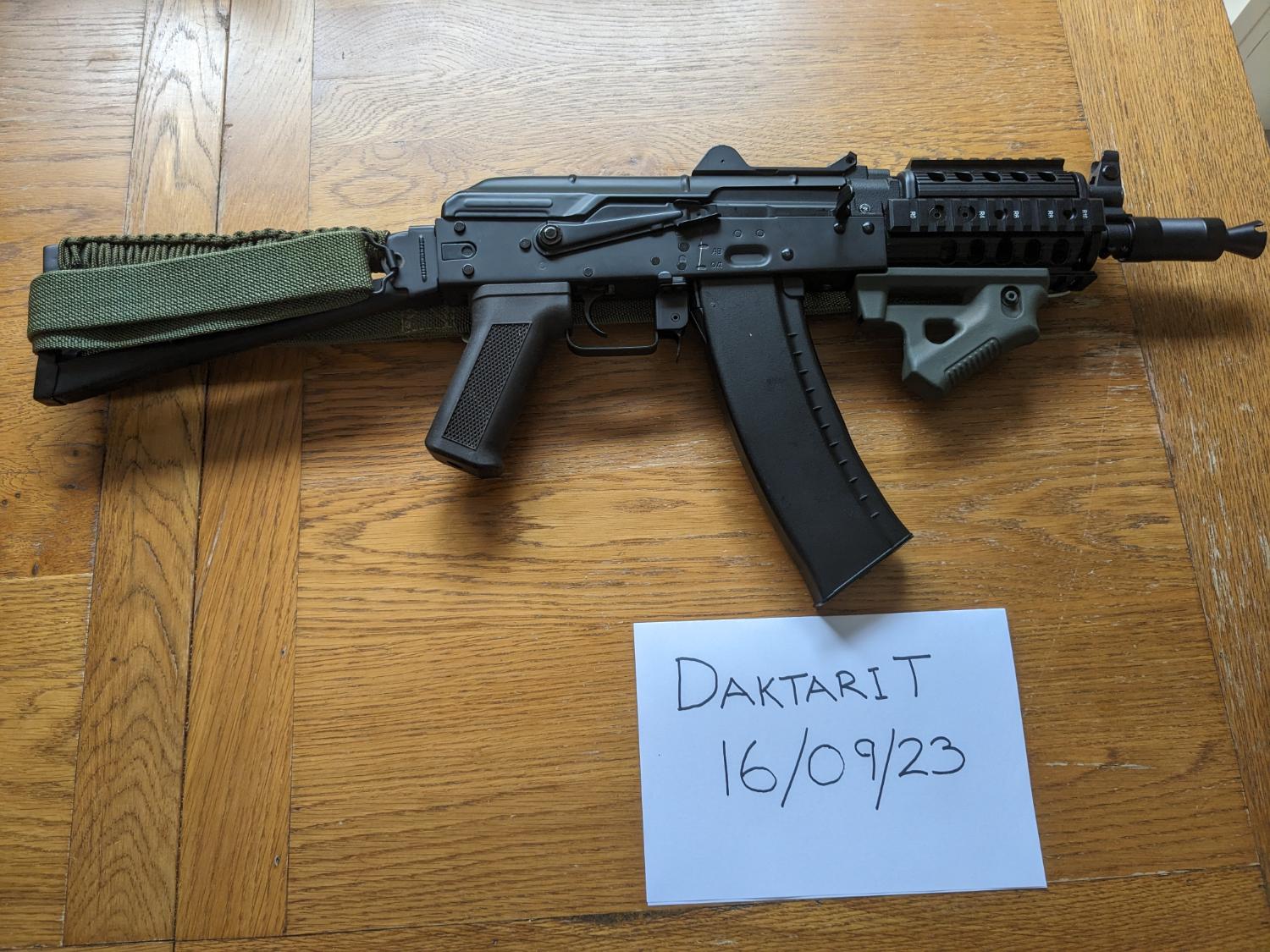 Cyma AK74u with 3 brown hi-cap, 5 black mid-caps, ris-rail (fitted), original wooden firegrip, 2 Ni-mh 9.6v 1600 mAh batteries and russian sling.