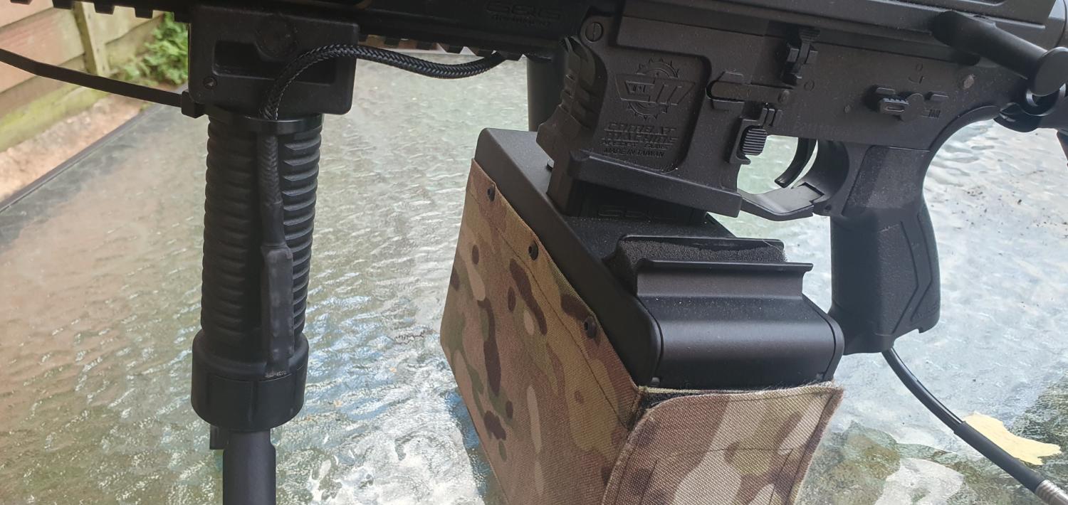 Drum mag has also been modified to wind via a pressure pad I have cable tied to the vert grip (as pictured) and therefore the original wind/auto wind feature has been disabled.