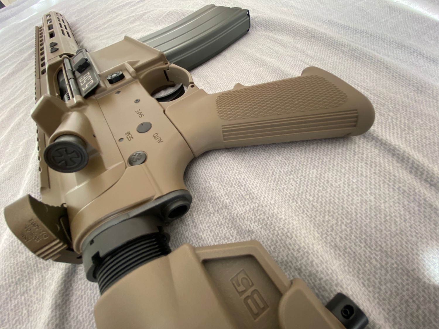 Exact replica of the Noveske N4 currently in use by US Navy SEALs at DEVGRU by A-Plus using the VFC V3 system. The VFC V3 system is probably one of the very best GBB systems on the market right now, right alongside the Tokyo Marui MWS system. One of the great new features of the V3 system is the trigger which is now a 2 stage trigger, which feels amazing and aligns perfectly with the real N4 that uses a Geissele 2 stage trigger.