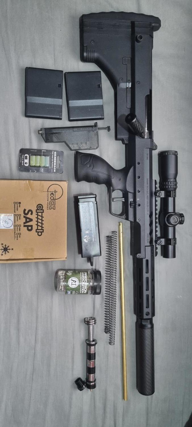 Scope, silencer, mags, upgrade parts spare, hard case, bbs, speedloader