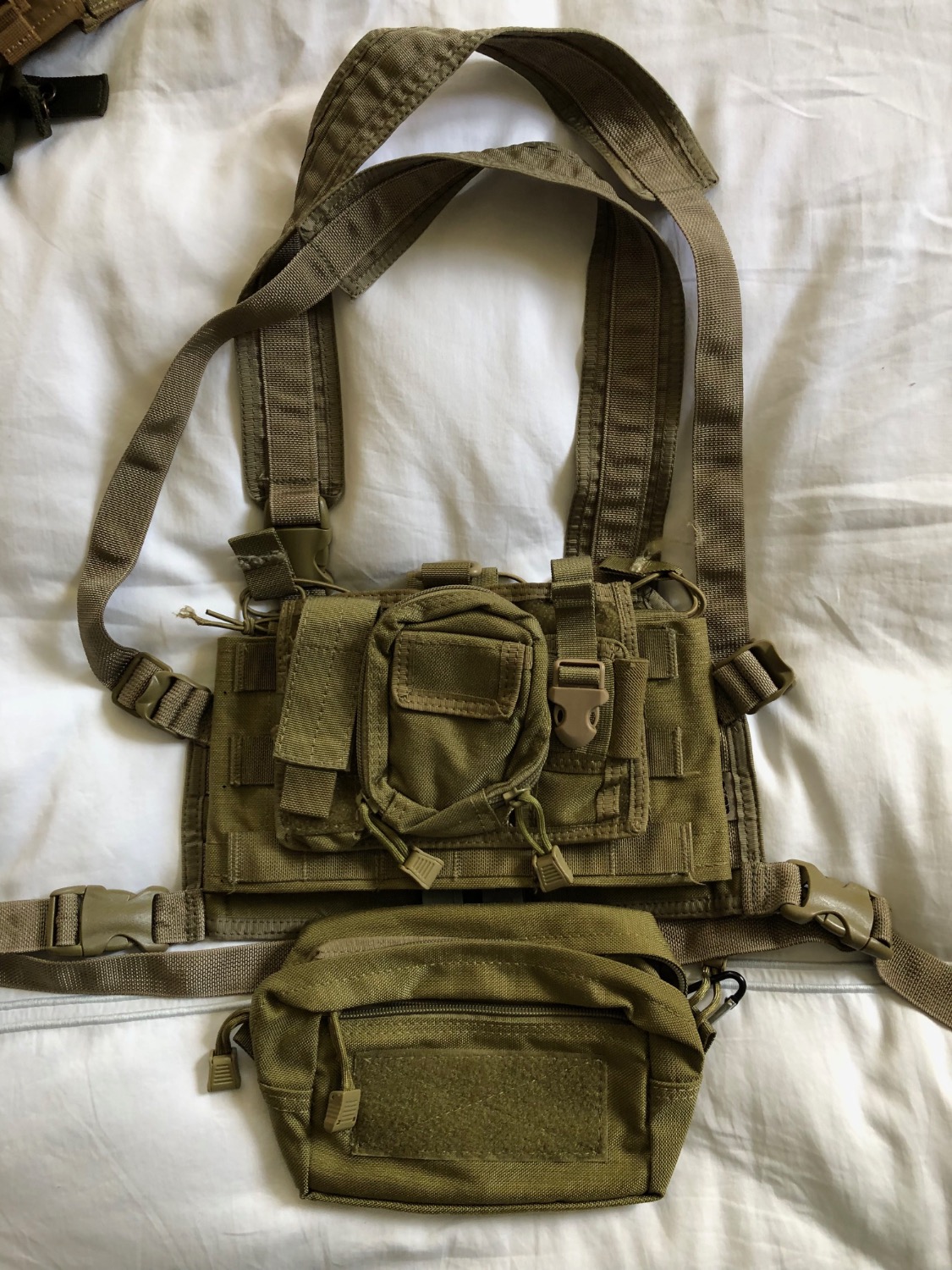 Original Sord in coyote/kaki Molle mini chest rig with Molle universal triple mag pouch (M4/AK) Molle admin panel with integrated mag pouch, radio pouch, utility pouch. Drop down Utility/Dump pouch.