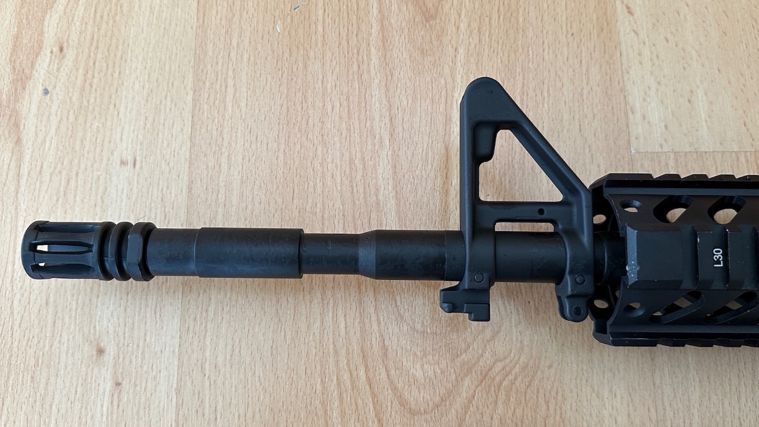 Front is a standard 7” RIS with a 15.5” barrel and bird cage flash hider. Again, signs of use and paint wear.