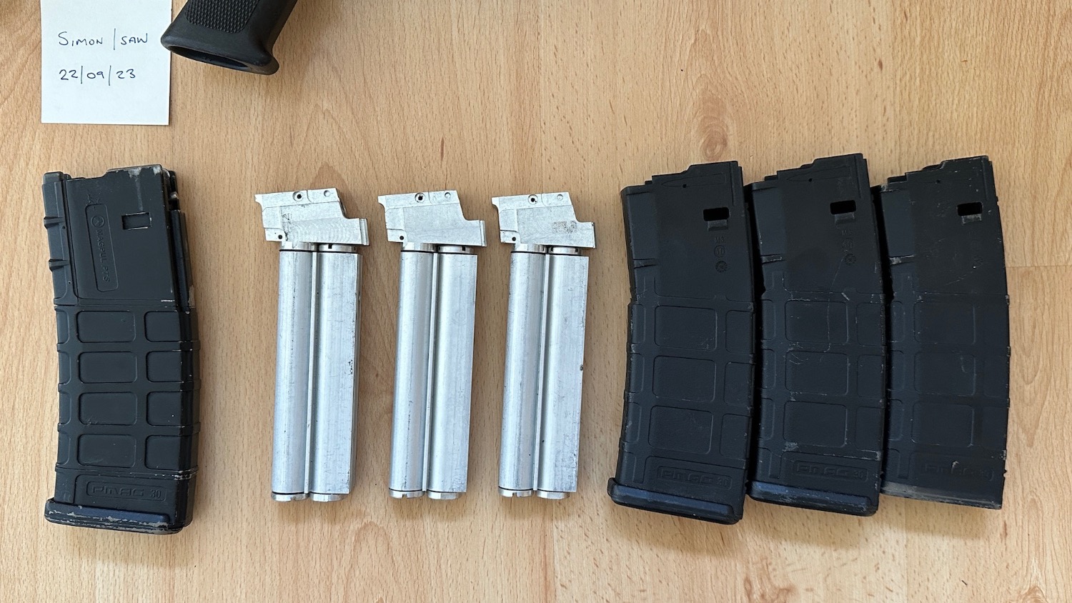 Comes with one gas PMAG and three PMAG shells (one missing base plate) and the aluminium insert parts which I have no idea what they’re for. Doesn’t seem to be leaking but can’t guarantee it.