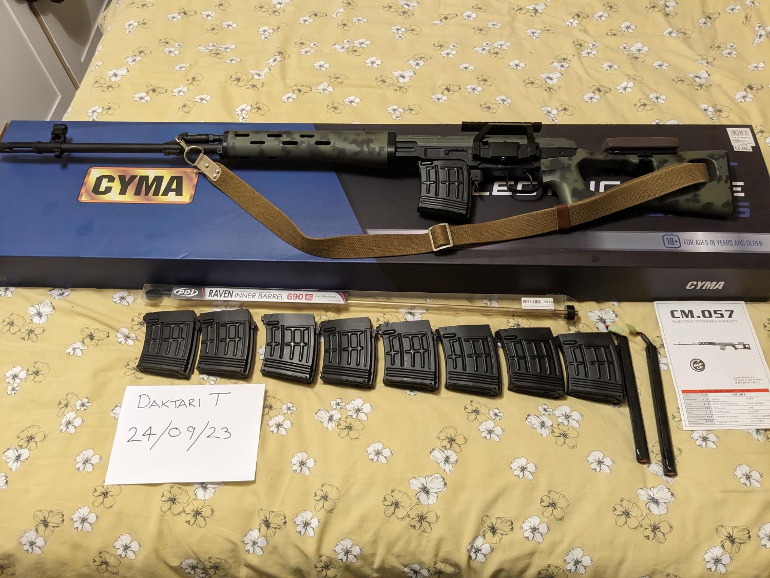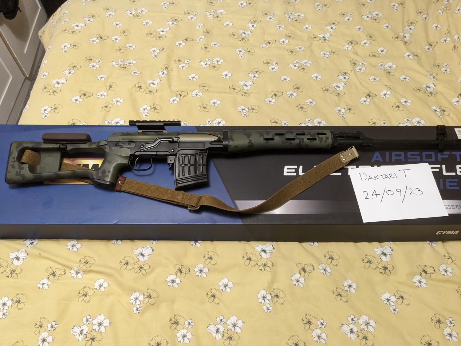 Flip up sight is missing but you are more likely to use a scope. Painted a subtle Olive on firegrip, stock and dust cover.
