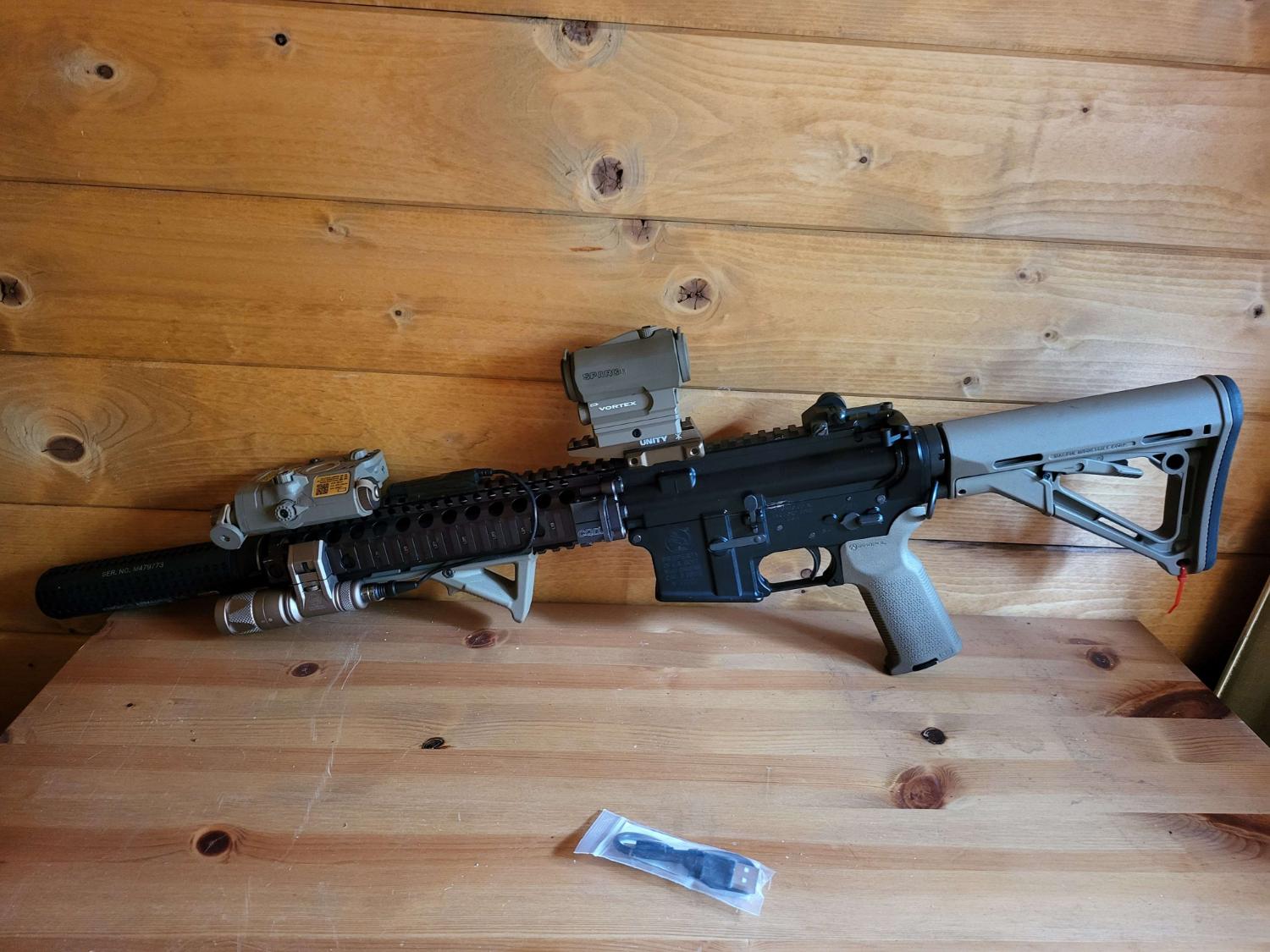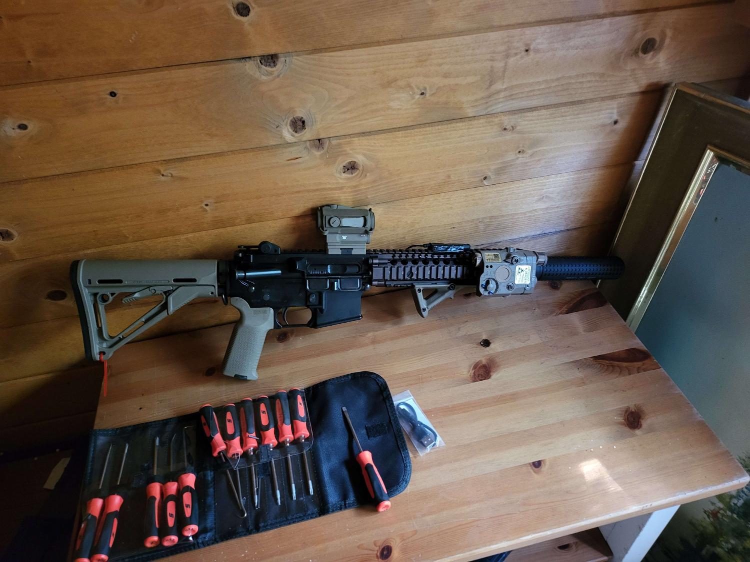 the gun has a magpul stock, pistol grip and foregrip, maple leaf barrel and hop unit, waldo snappy boi spring, peq and torch and a acetech tracer unit, 5 gmags, angry gun 300% recoil buffer.