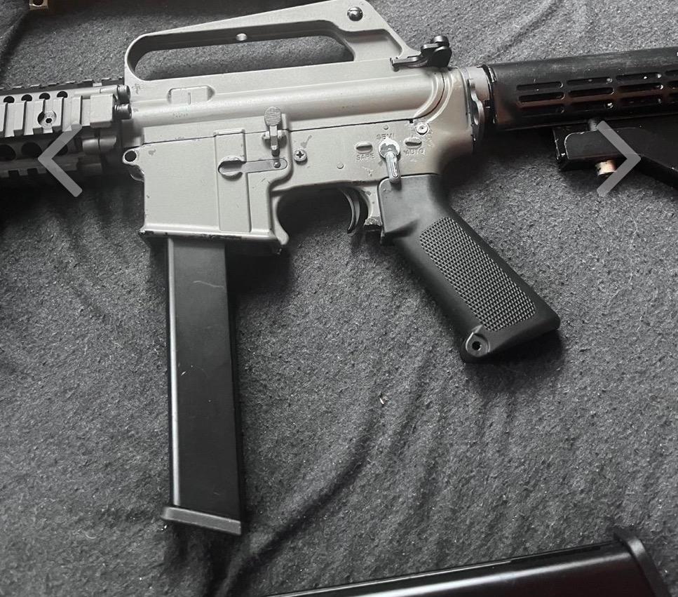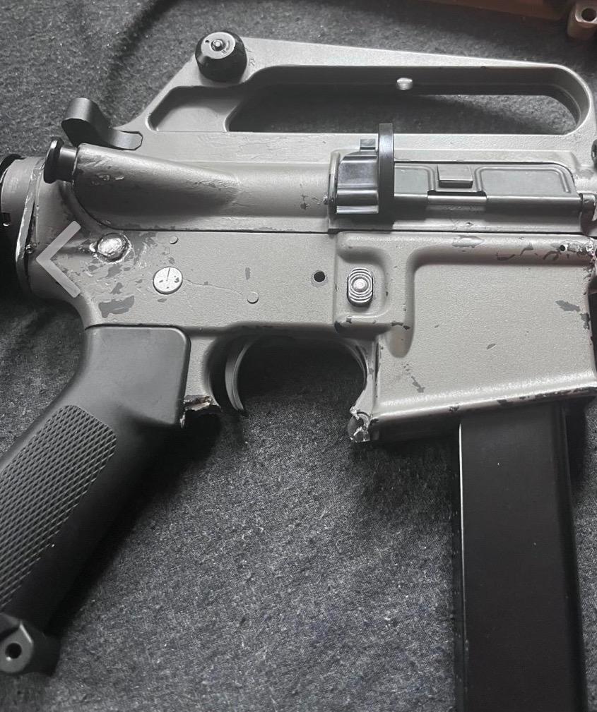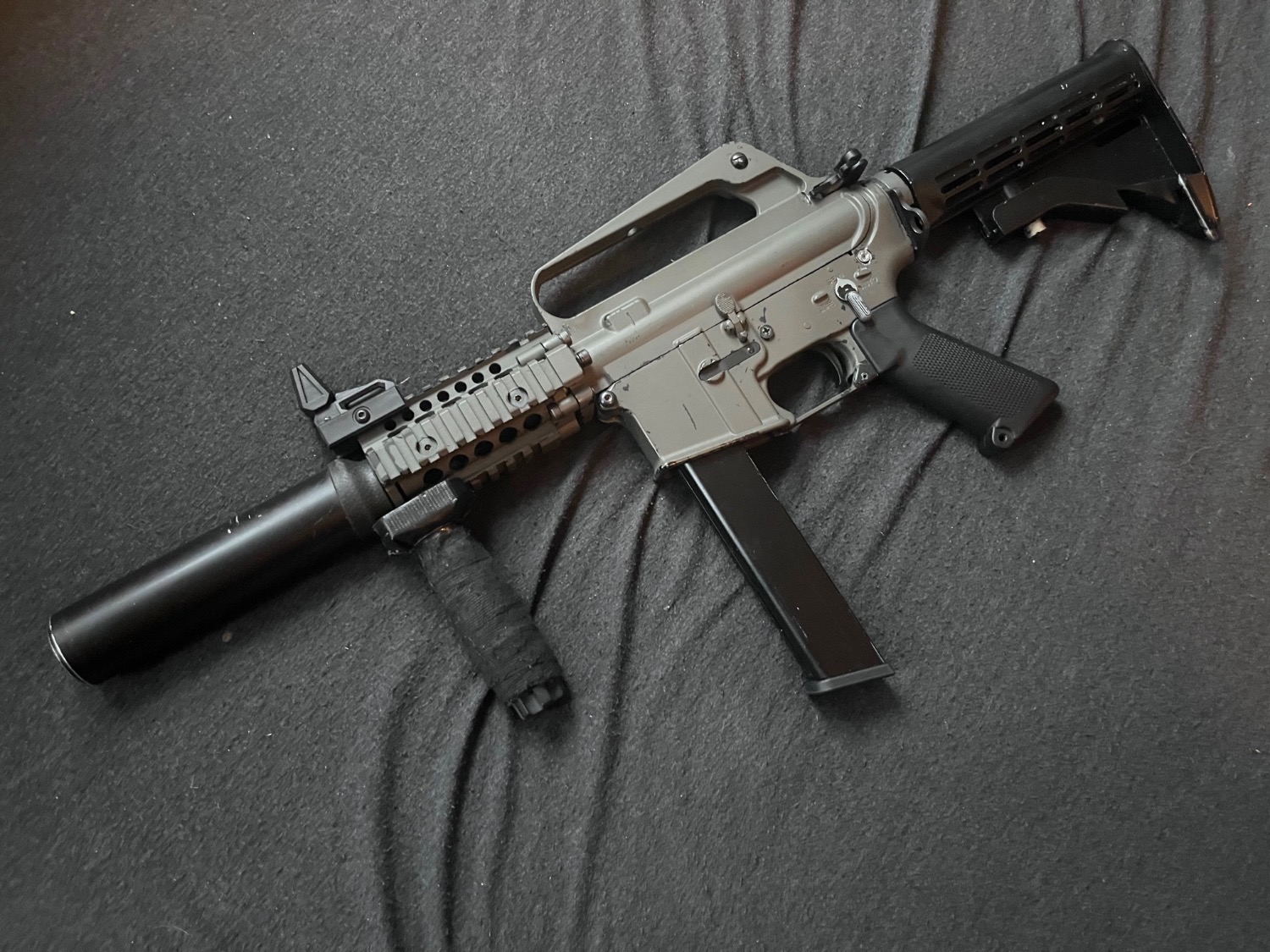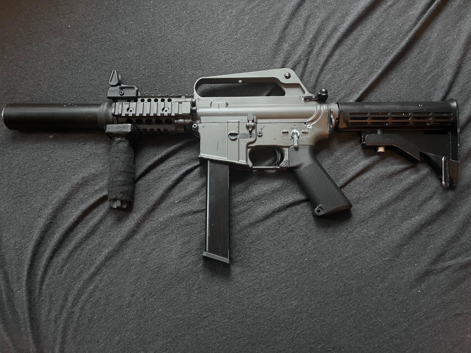 This was all put together from bits acquired over the years. I wanted to build a colt smg style gun with an A1 carry handle on a pcc lower. Tolerance issues meant that to have the upper and lower sit right for the bolt to cycle, you have to use an AEG front receiver pin.