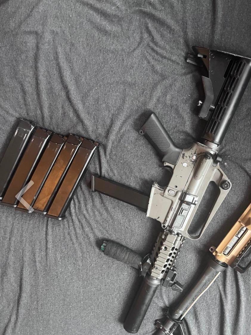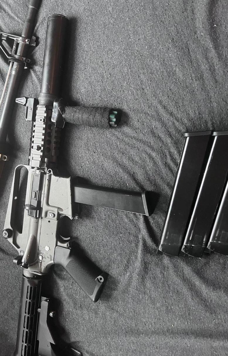 So there’s the A1 carry handle upper with a G&P short RIS II style rail, 10 inch barrel covered up with a custom suppressor that attaches to the threads and sleeves the barrel. Also has a real colt smg dust cover and deflector from Brownells