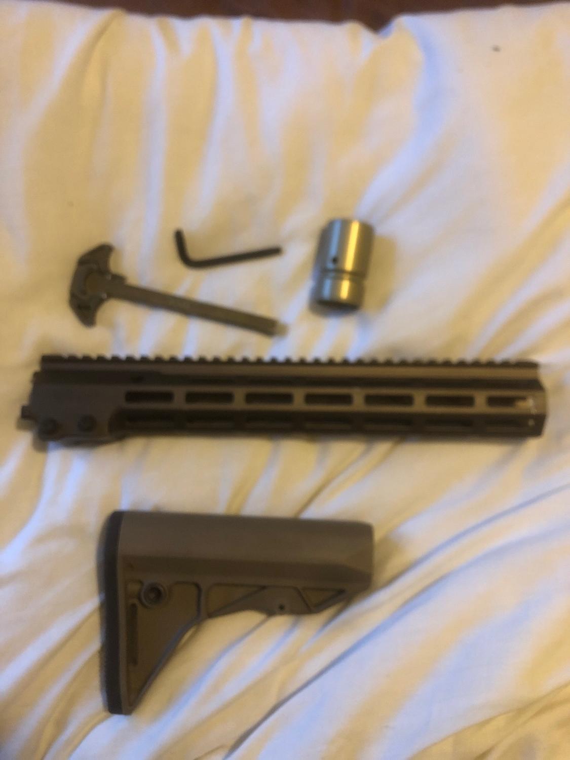 Only a few scratches on most the pieces and a little bit of wear due to game use, it’s a nice rail and comes with a pts stock, the handguard and charging handle are zparts