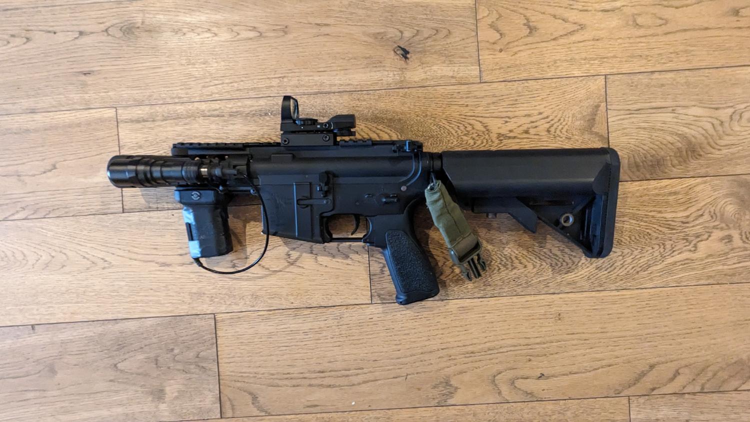 Misc: Cheap alternate stock (never installed), Ergonomic underbarrel grip (changed due to torch pressure pad install)