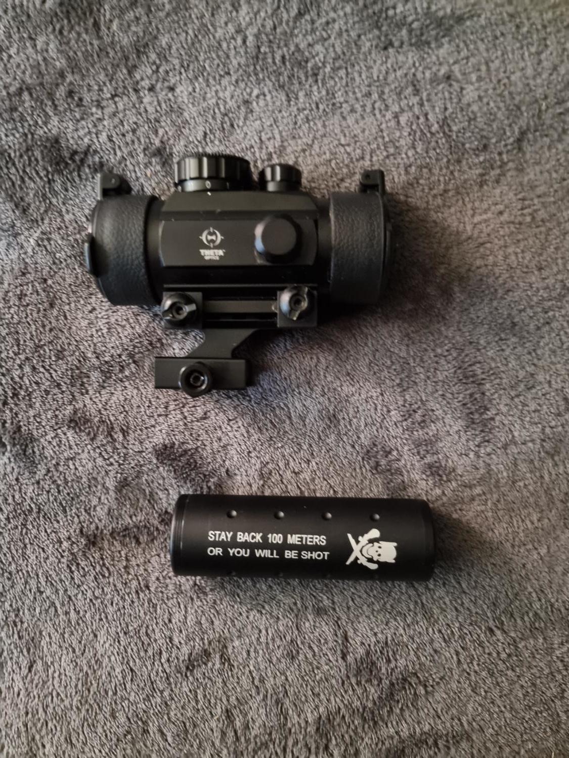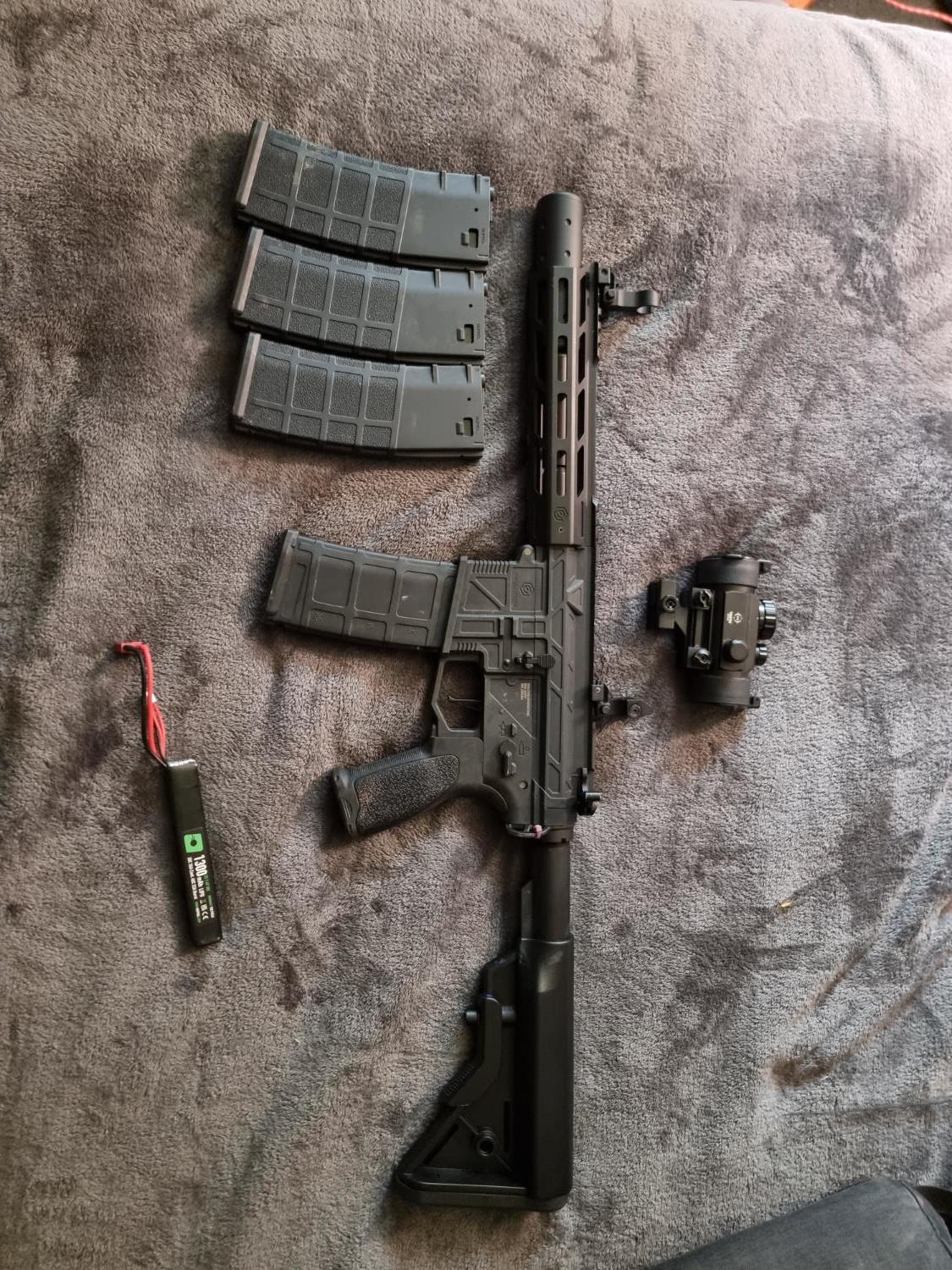 Scope 3x , silencer, scope riser, 3 nuprol mags, 7.4v battery