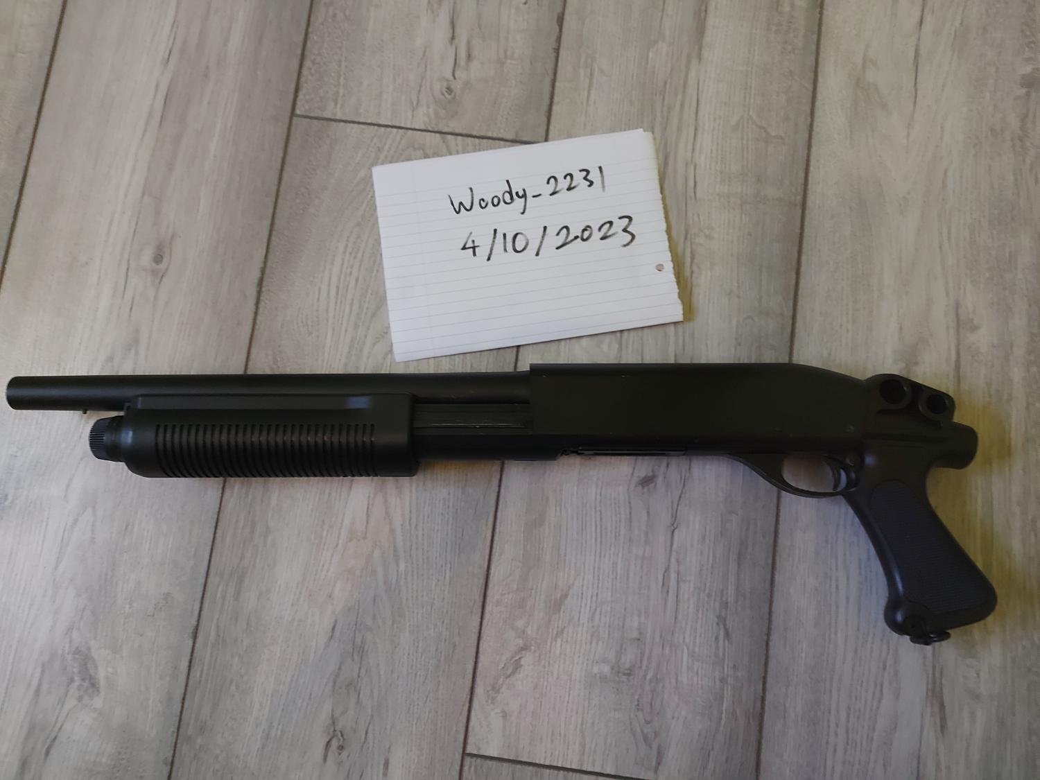 Pump action tri-shot spring shotgun. Comes with two shells.