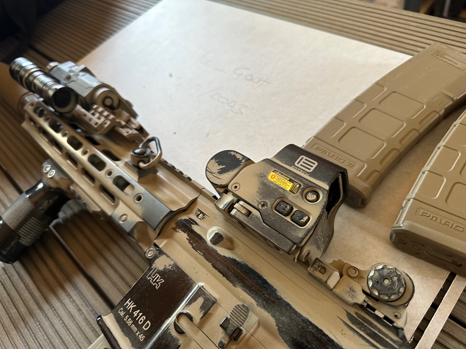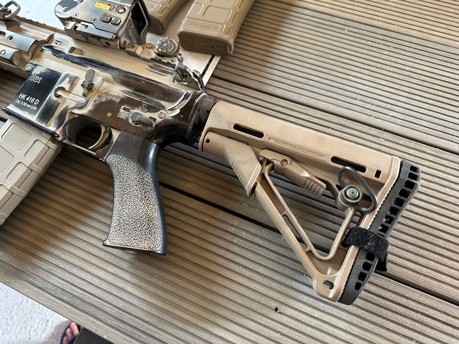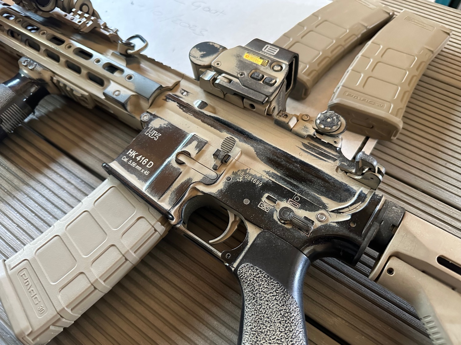 Tokyo Marui 416d NGRS bought 2021 from Combat South. Wired to stock. Needs small stock batteries. Custom paint job.