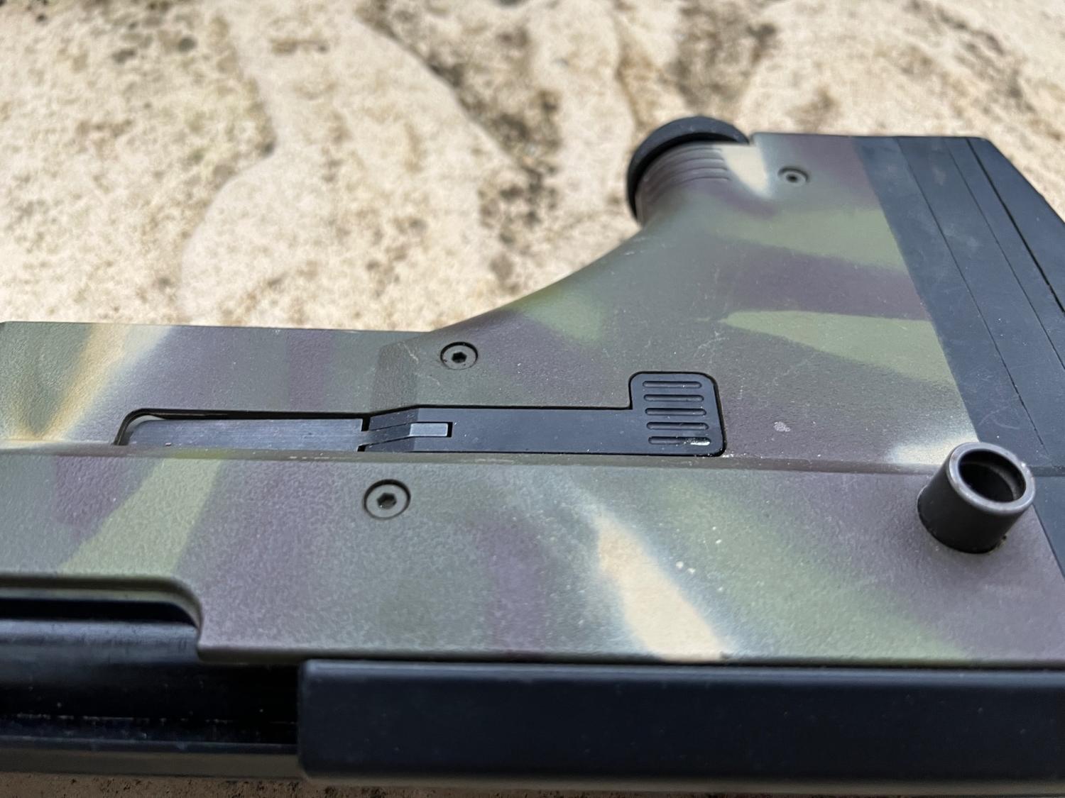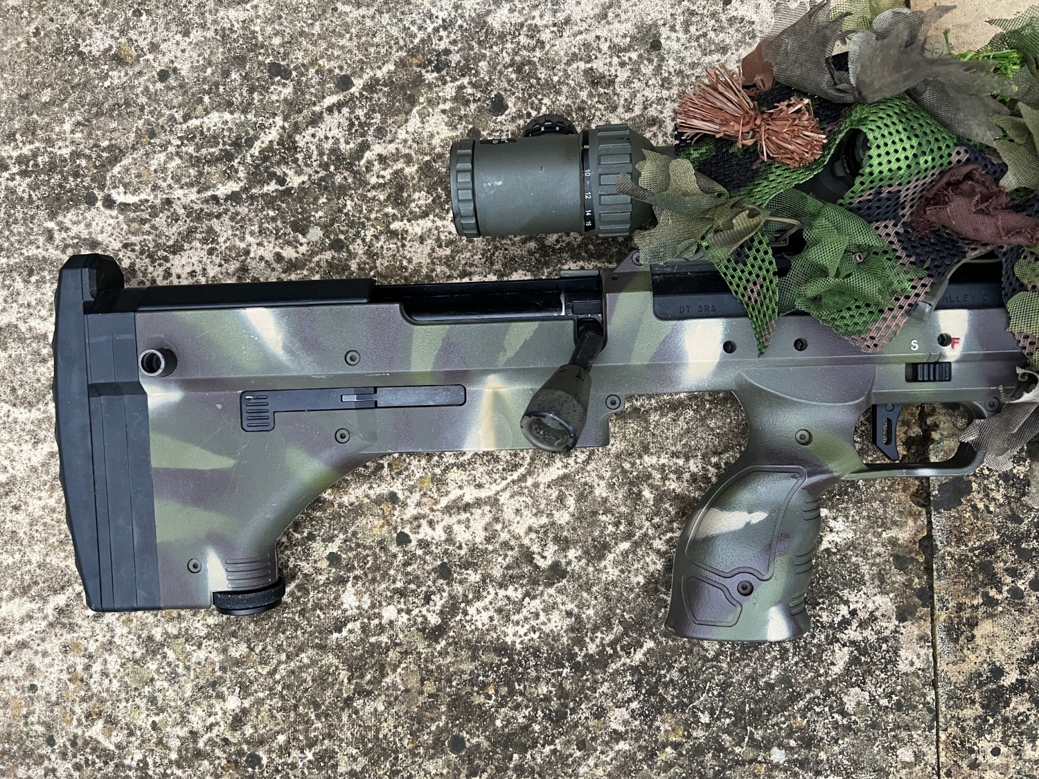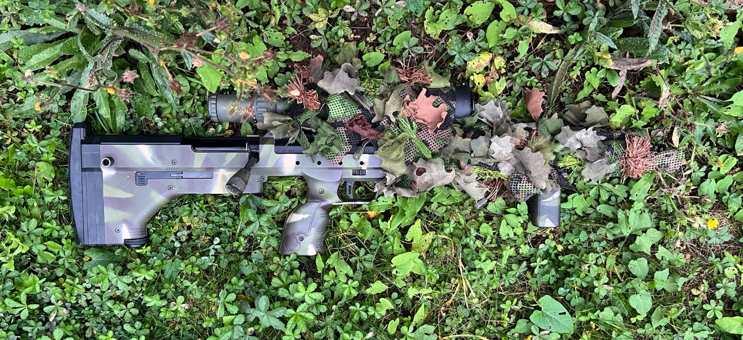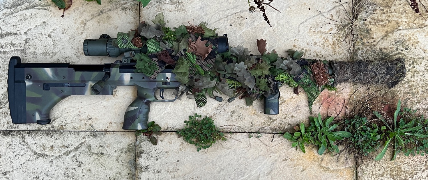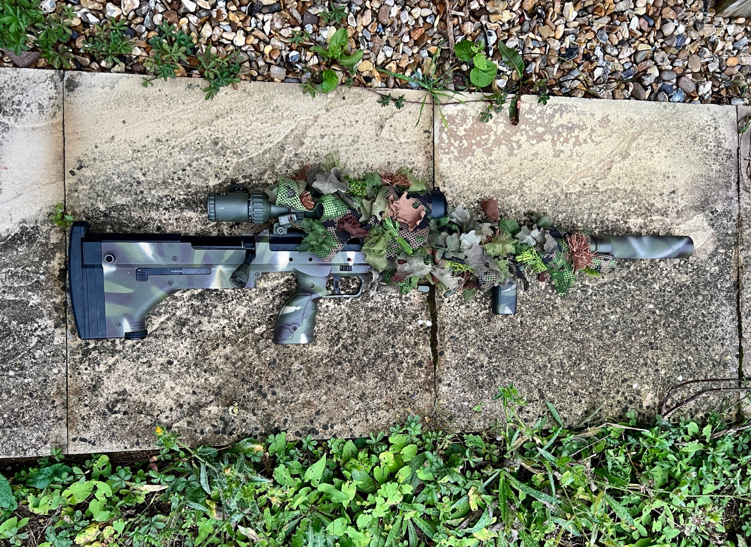 The camo wrap and paint job work really well and as can be seen in the pictures the wrap breaks up the outline of the gun + makes it fit in well with foliage.