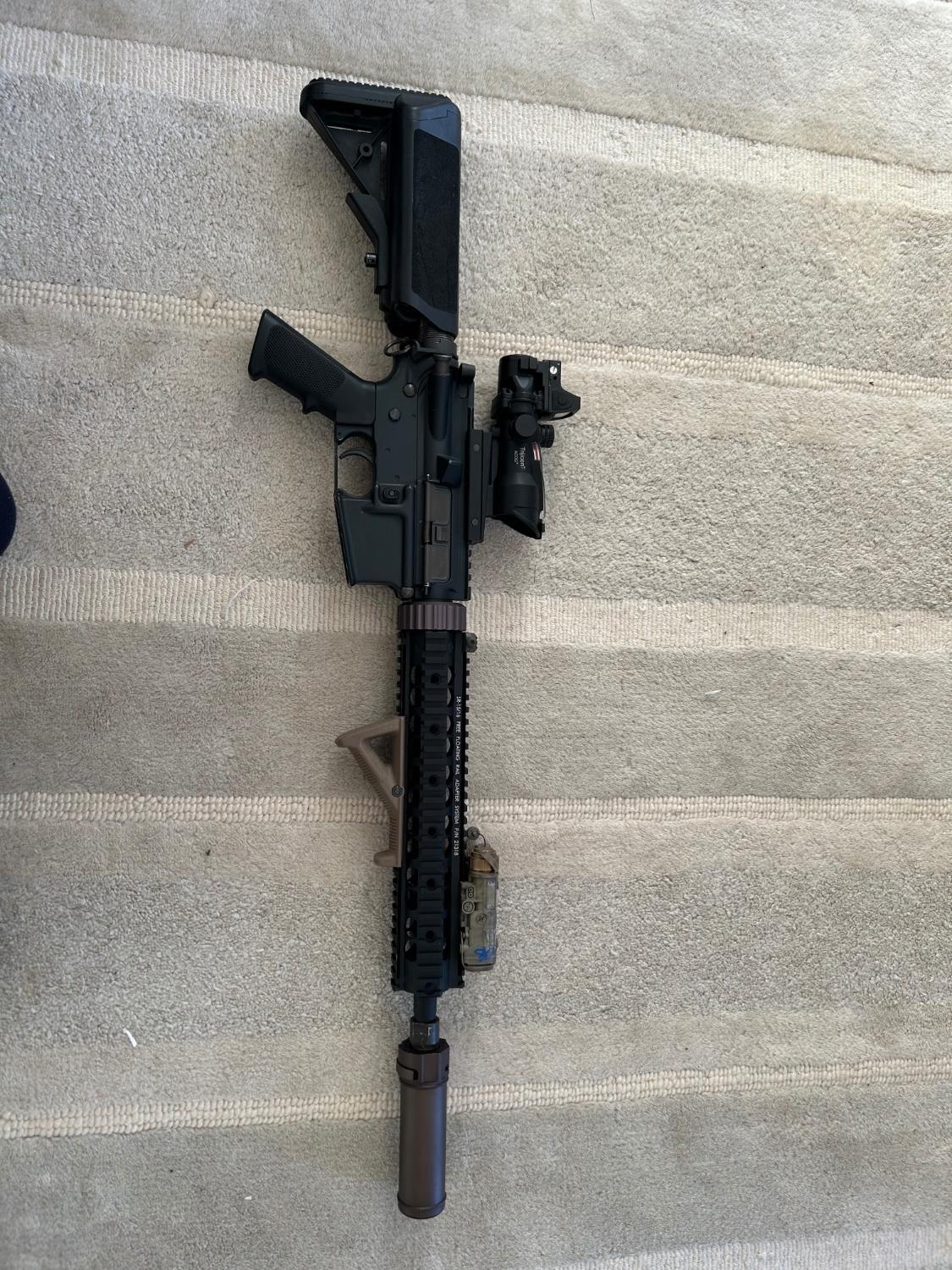 Externally an unknown 14.5 barrel with 14mm threads (can use standard airsoft muzzle devices), nuprol suppressor, replica ngal, acog and airsoft artisan mk12 rail have been added. Note the surefire scout mount, light itself has been removed as it was broken on another RIF