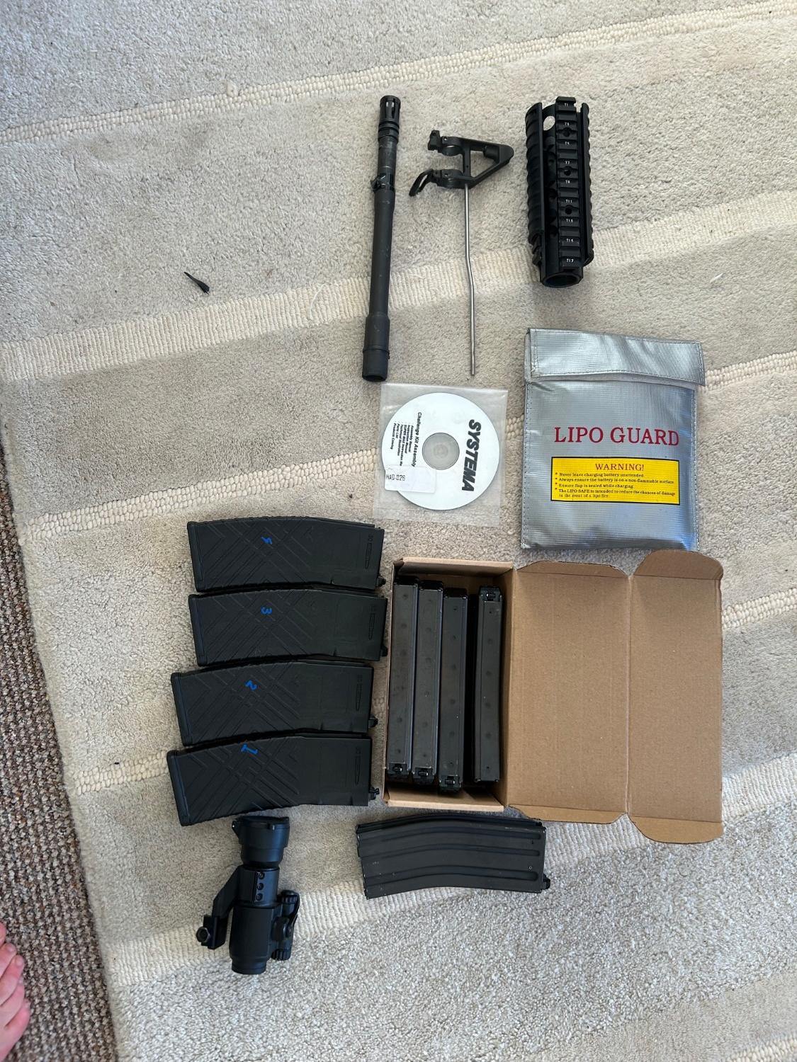 Comes with everything pictured, including repro Aimpoint, 5x systema mags and 4x blackcat mags, original cqbr barrel, flash hider, rail and front sight post/gasblock. Will also include two batteries and systema cd.