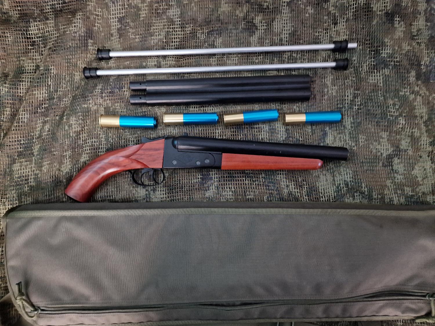 Picked up recently in a trade but after playing a few rounds with it I can't see it getting much more use. This was the long barreled version but I removed the inner barrels and outer barrel extensions for a better spread at short range. All parts present to put back together if wanted. Comes with 3 fully working shells and 1 for spares, spare seals and scabbard.