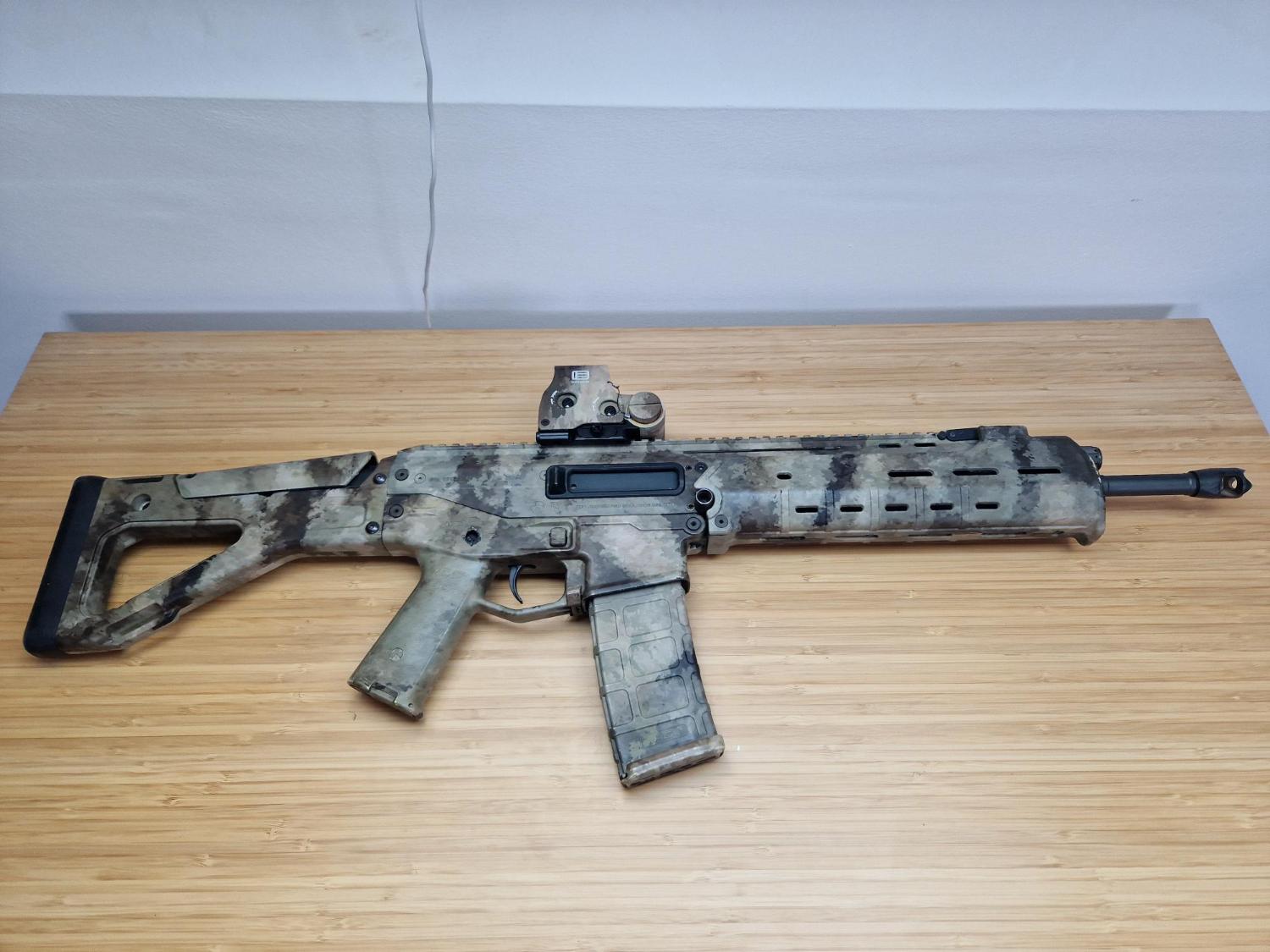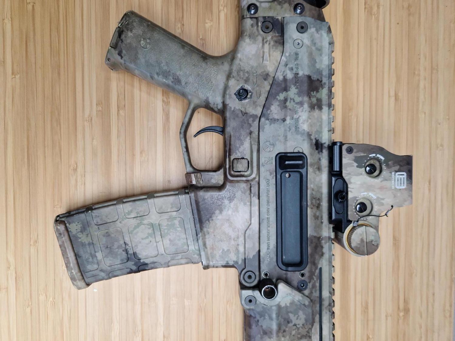 This is hard one to come by since it features an A-TACS camo and a matching red dot and two original rare PTS mags also in A-TACS.