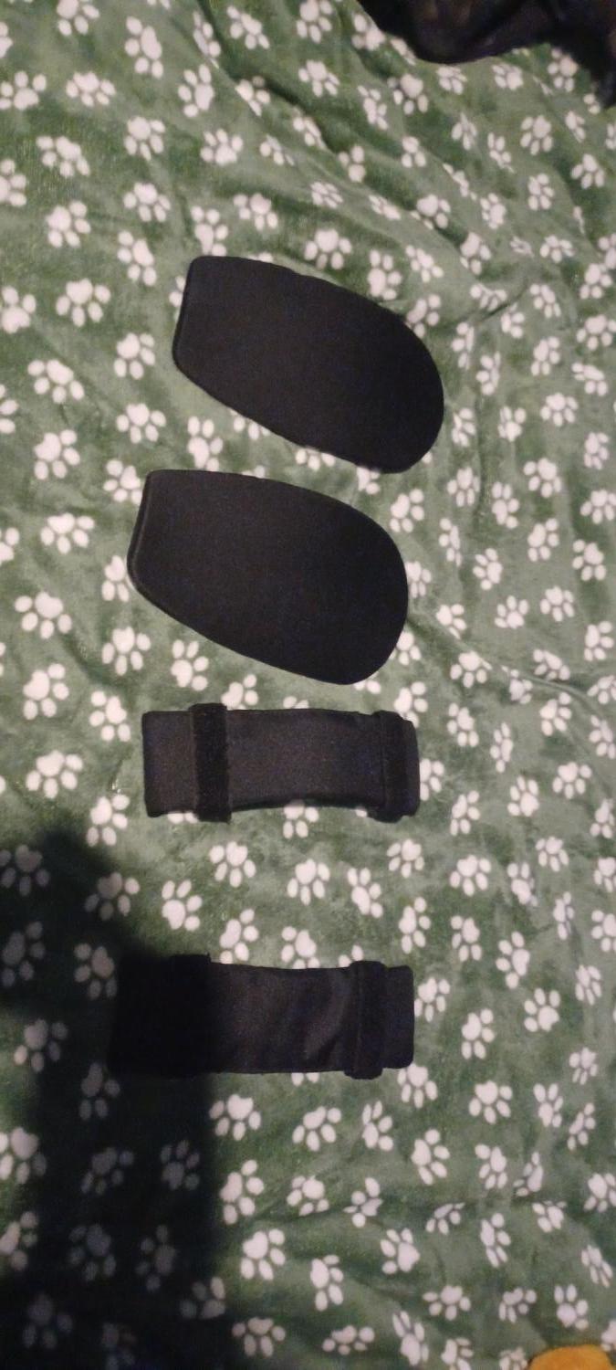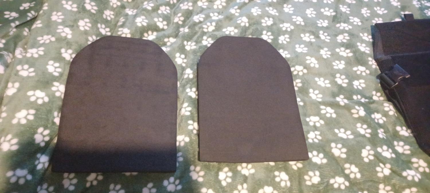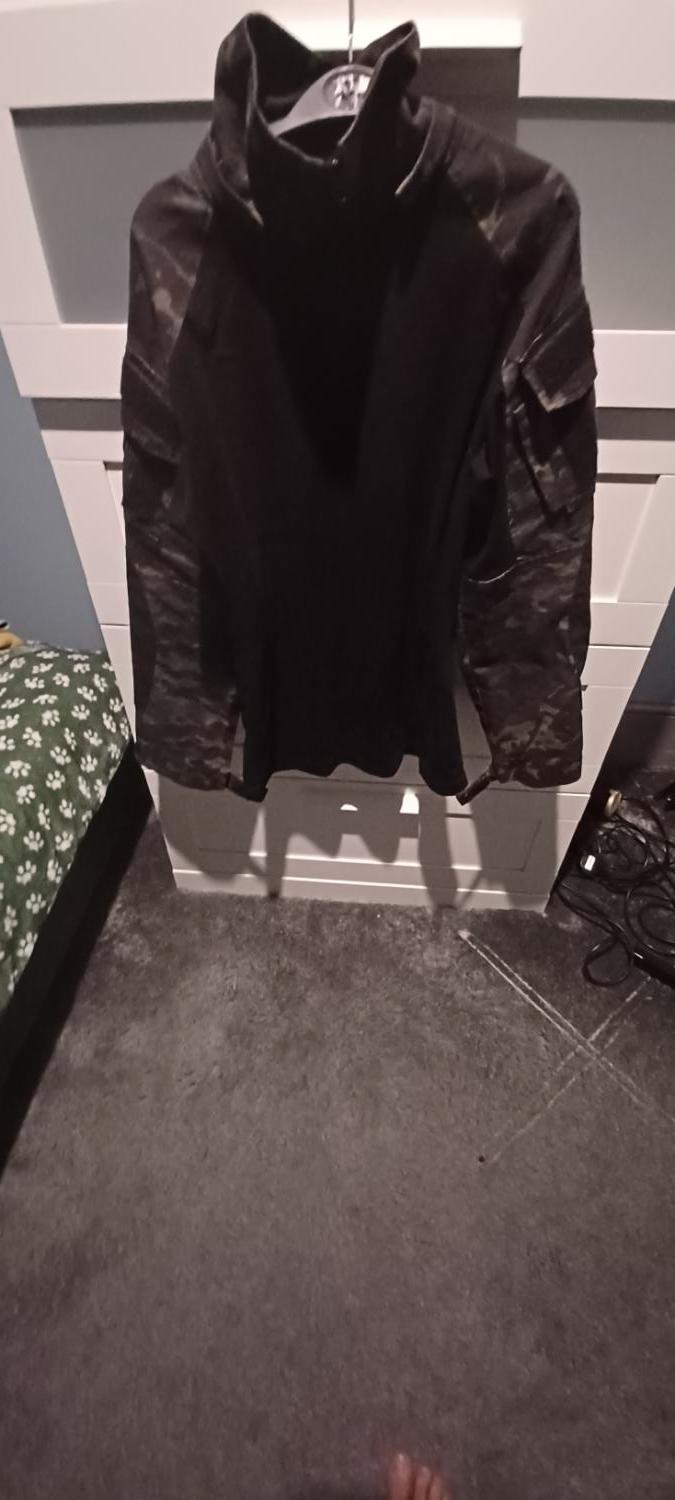 Plate carrier not used to much just sat in wardrobe has 2 foam plates which are thick and has shoulder straps to stop rubbing these are the long strip thing in the images (next to them is elbow pads. Some black camo stuff will do £10 for camo and £20 for plate carrier for both £28. Any questions give a shout. Shirt is a small and comes with elbow pads, foam, that go in a hole with velcro and a hood that is detachable with a zip also has strigs. Trousers are warn down but still stop brambles and stinging nettles from attacking your legs. Trousers are 12-13 years.