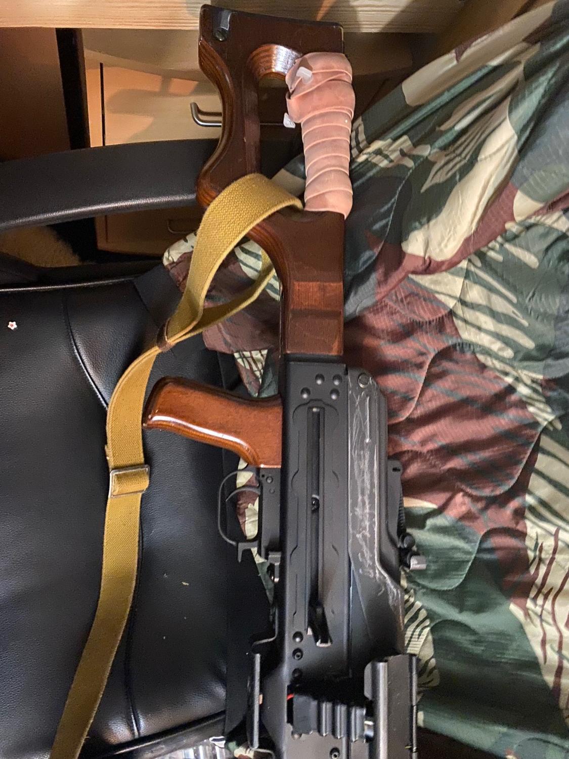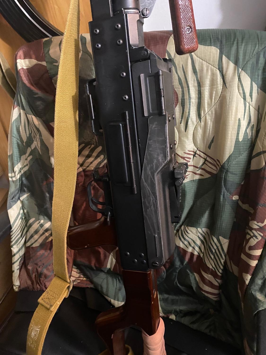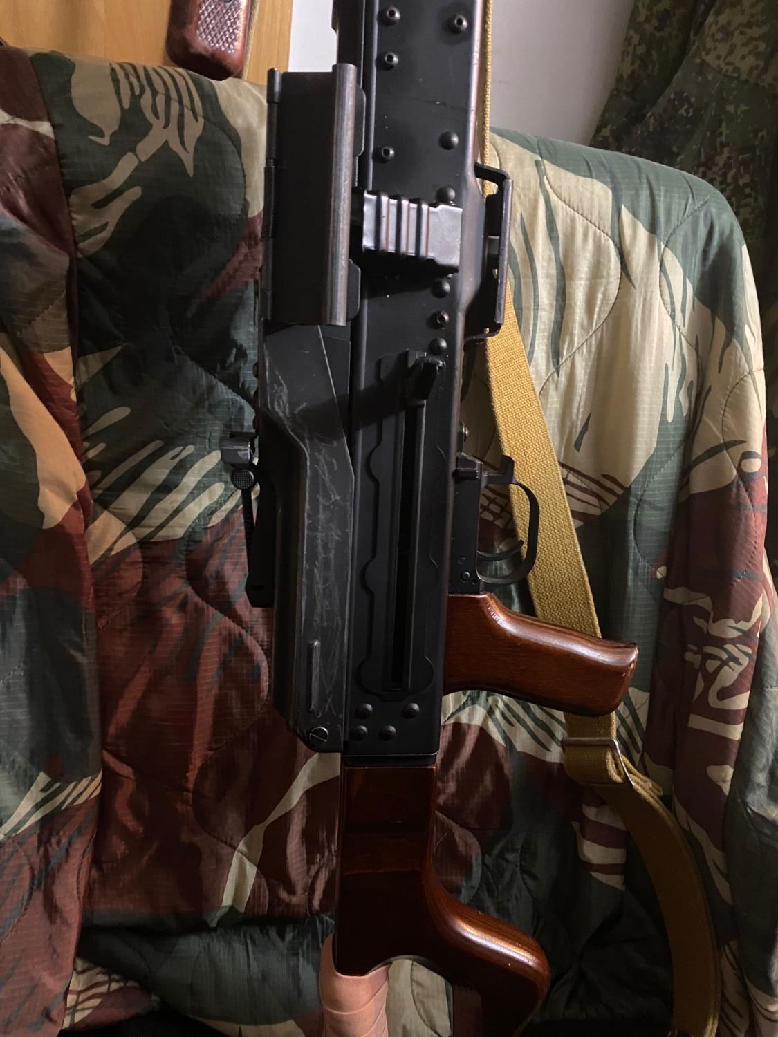Guns had may be 100 rounds out of it never been used at a game just for photos and a wall hanger . Has a R/S pkm carry handle and a bull gear hop up ( not installed )and pkm belt .Gun has a chip out of the feed tray under the top cover and pkm rounds see photos this can’t be seen unless ur looking for it. Any electrical tape is just to protect cables near pinch points and reduce noise on the gun when moving . Some ruffing up of paint on top cover as was going to age it but never got round to it . 500 posted in the Uk