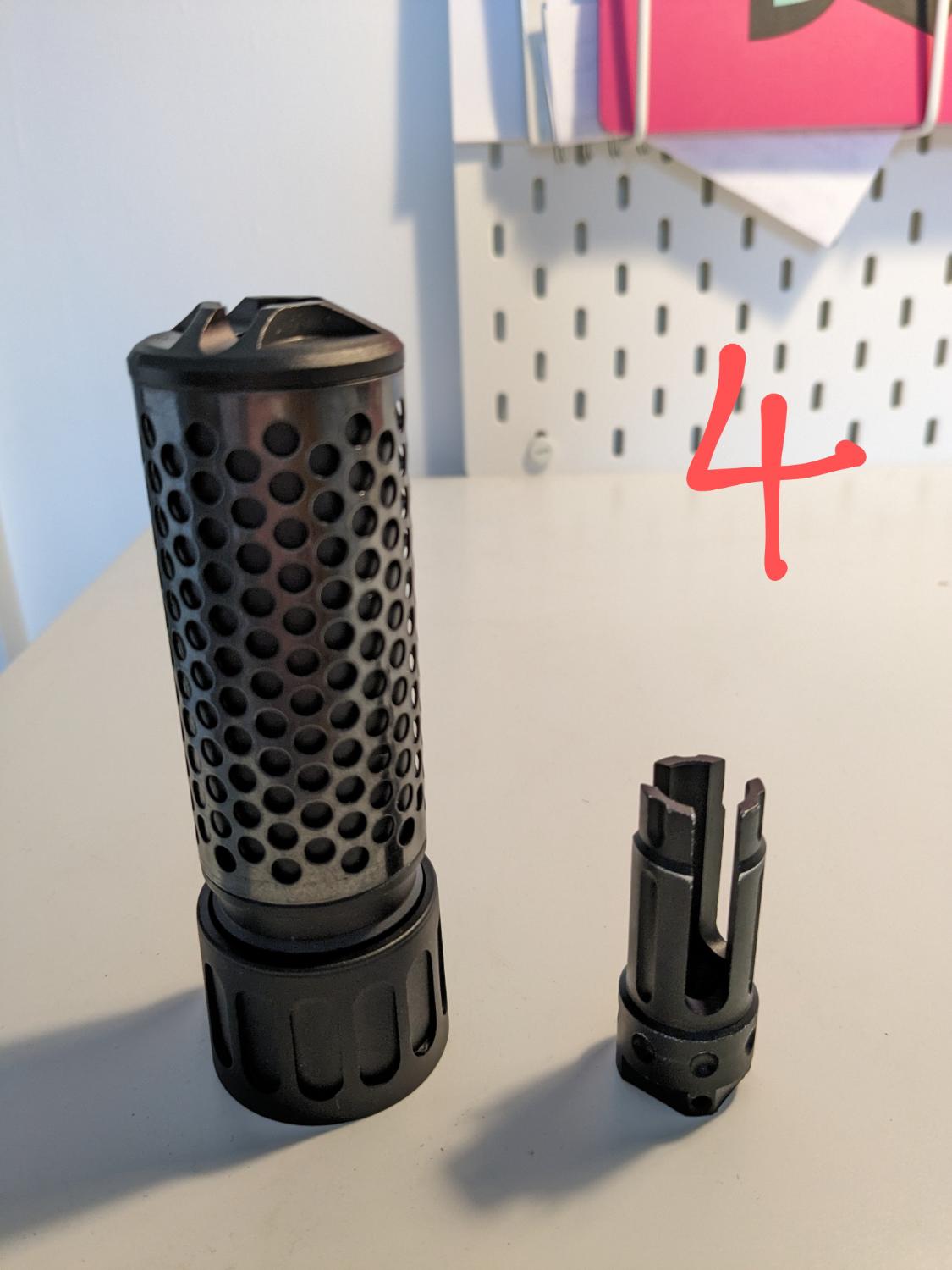 4. QR suppressor with 14mm CCW flash hider (12.5cm L 3.6cm W) sold