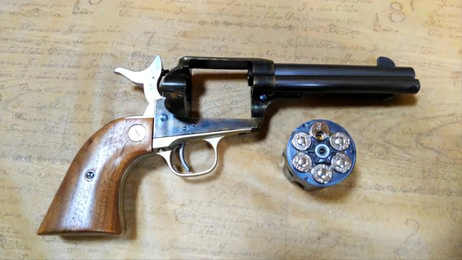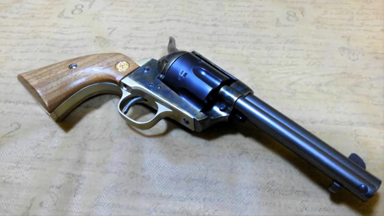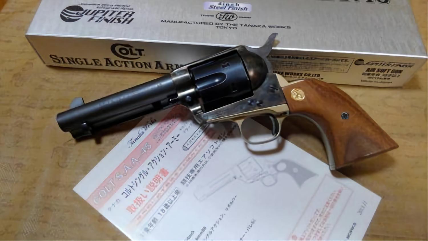 Another SAA on the way from the land of the rising sun. This was originally a steel Jupiter Finish, but has been repainted to look like a case-hardened custom finish. The original grips have been replaced with genuine wooden grips. Fully working, comes in the original box with paperwork.