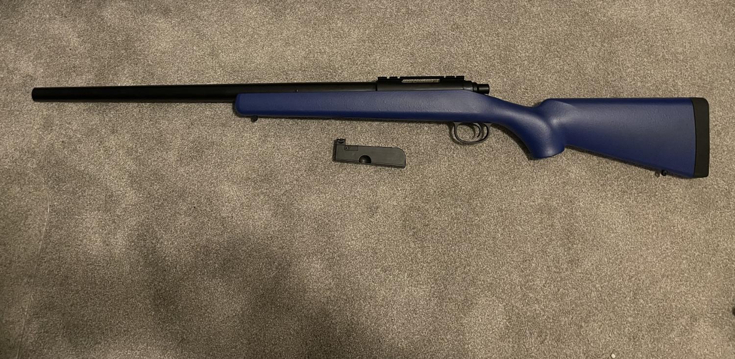 Used in the garden and skirmished once, but sniping is not for me. Small corner of the plastic casing has broken off near where the bolt drops down after cocking the gun, but this doesn't affect anything. Free P&P.
